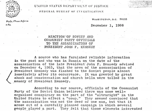 В справке 1966 года, отмеченной пометкой «совершенно секретно», говорится о реакции советских властей на сообщение об убийстве Кеннеди. Источник ФБР утверждал, что убийство американского президента потрясло руководство СССР. «В церквях звонили в колокола в память о президенте», — говорится в документе.