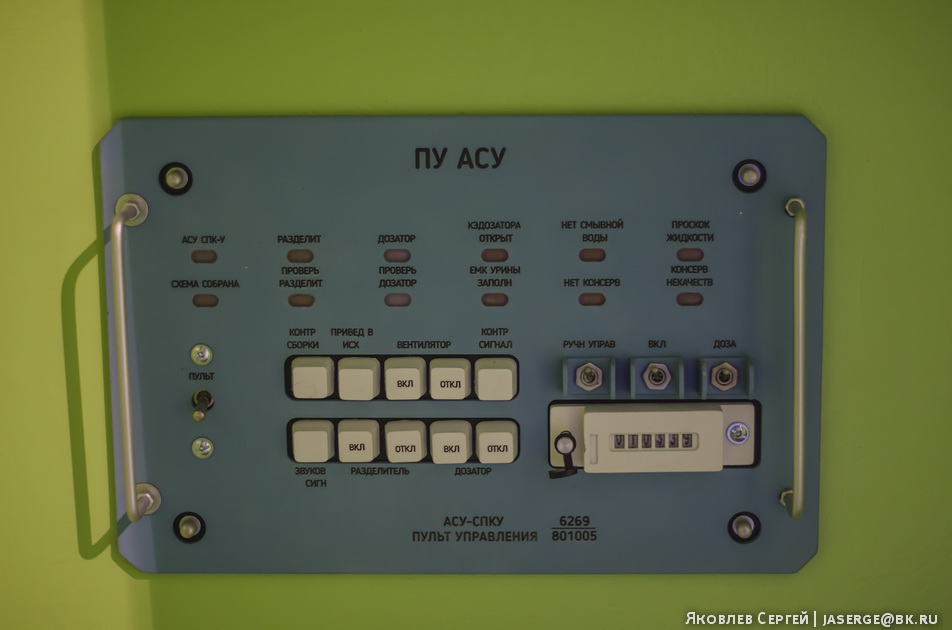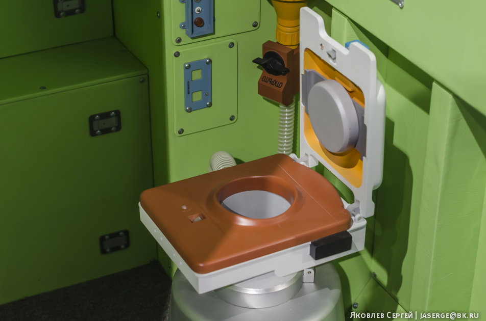 Он похож на обычный земной, но есть и свои особенности. Унитаз снабжён фиксаторами для ног и держателями для бёдер, в него вмонтированы мощные воздушные насосы. Космонавт пристёгивается специальным пружинным креплением к сидению унитаза.