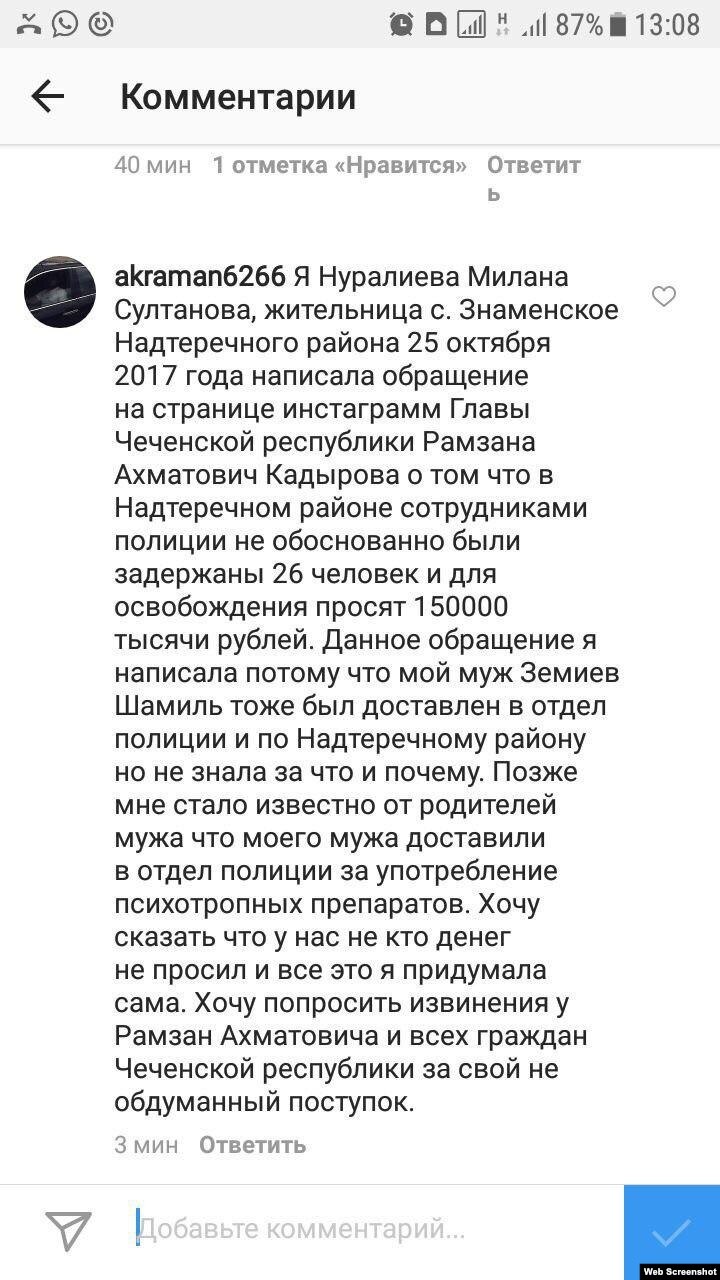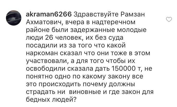 Милана Нуралиева, супруга одного из задержанных, попыталась через инстаграм связаться с Рамзаном Кадыровым. Она обвинила полицейских в вымогательстве 150 тысяч рублей. По ее словам, многие мужчины даже не предполагают, за что они задержаны.