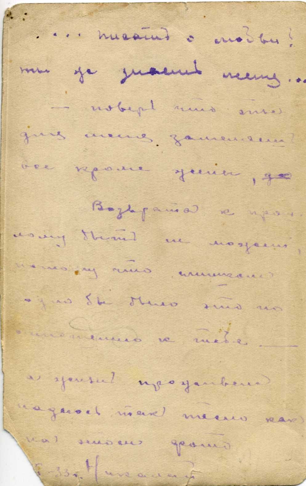 «…писать о любви? Ты же знаешь меня… Поверь, что ты для меня заменяешь все, кроме жены. Возврата к прошлому быть не может, потому что слишком подло было бы это по отношению к тебе. А жизнь проживем, надеюсь, так тесно, как на этом фото. Май — 33 г. Николай».