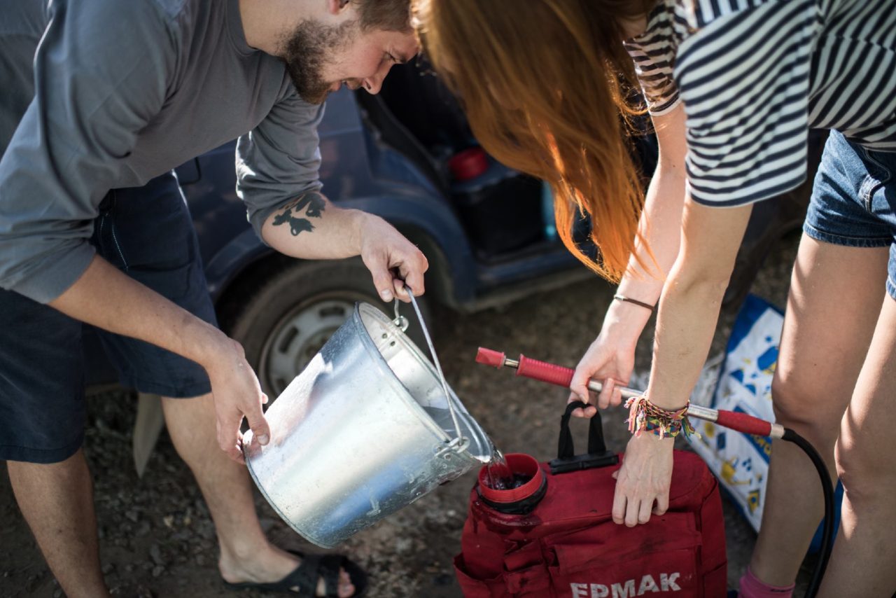 Максим с Алисой наполняют ранцевики водой перед выездом на пожарФото: Алина Десятниченко