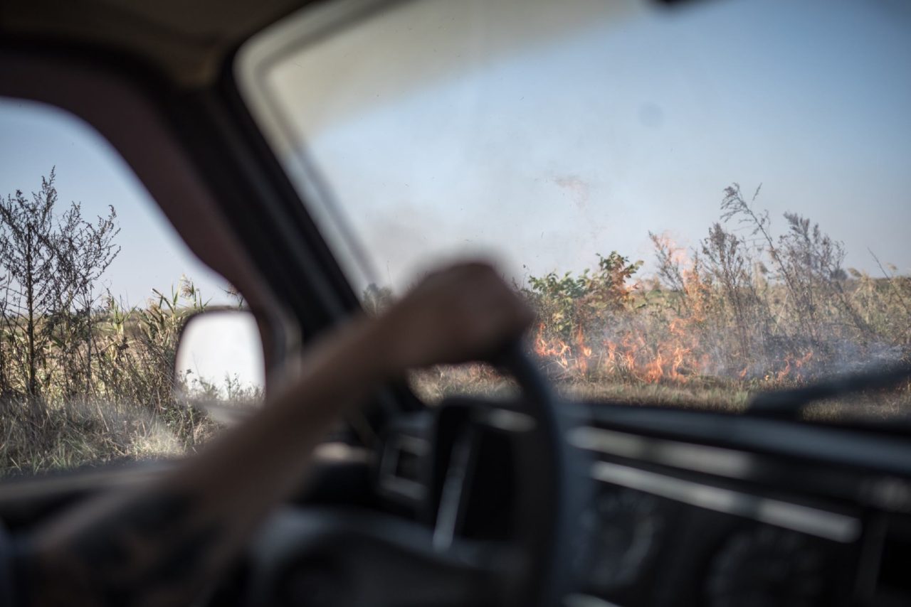 Максим тушит траву вдоль дороги между рисовыми чекамиФото: Алина Десятниченко