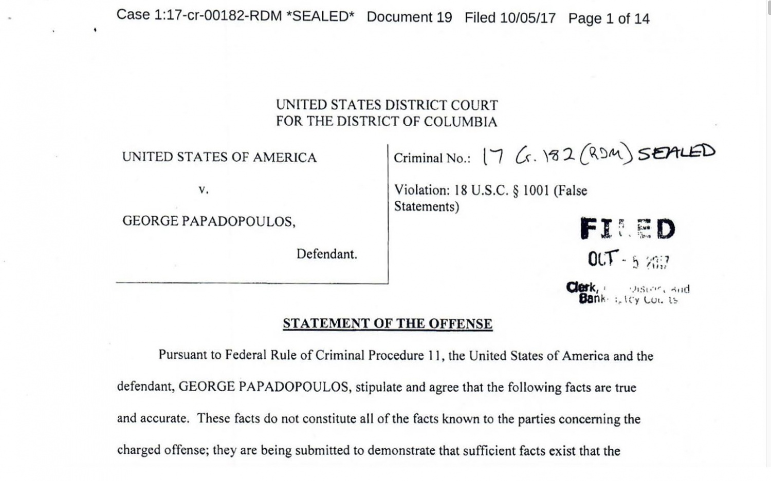 Из документа явствует, что Пападопулос пытался свести трамповский штаб, а впоследствии и самого Трампа с российскими представителями с целью улучшения американо-российских отношений. Попытка не удалась. В ней не было ничего, что бы противоречило американскому законодательству. Но когда ФБР допросило Пападопулоса в январе 2017 года в рамках расследования предполагаемого сговора трампистов с Москвой, он, как выяснилось, несколько раз соврал.