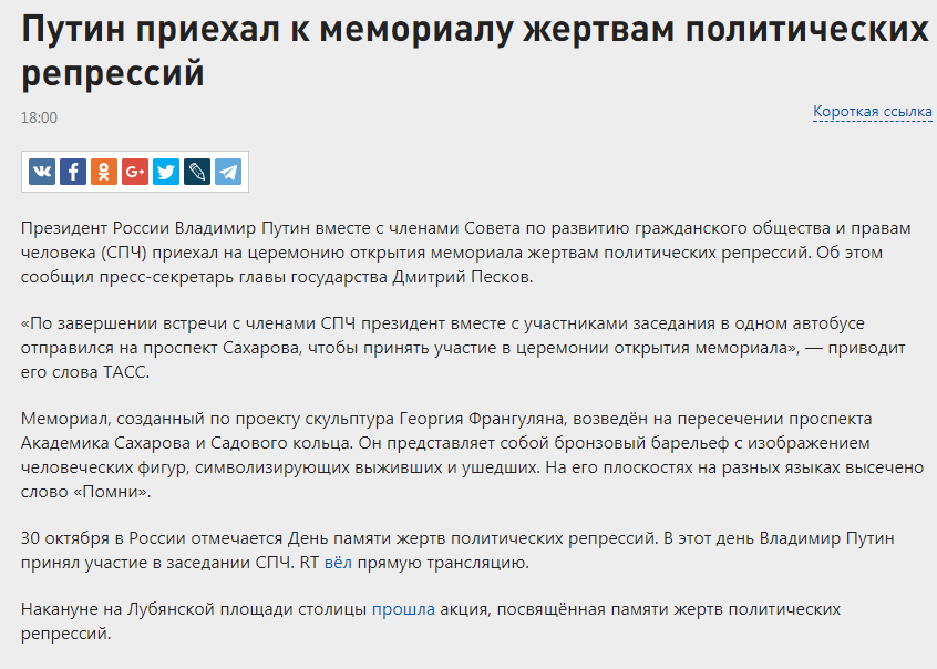 - Президент России Владимир Путин уверен, что репрессии в прошлом страны невозможно ни оправдать, ни забыть. Об этом он заявил на открытии Мемориала жертвам политических репрессий. Глава государства напомнил, что в сталинские времена любой гражданин мог быть обвинен в надуманных и абсурдных обвинениях, "миллионы людей объявлялись врагами народа, были расстреляны или покалечены, прошли через муки тюрем или лагерей и ссылок". Путин назвал это время страшным прошлым, которое нельзя вычеркнуть из народной памяти и ничем оправдать.