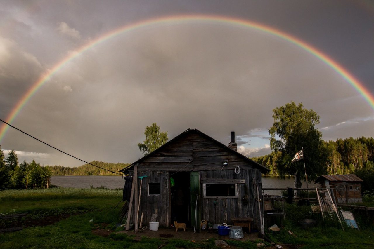 Прождав его час, принимаем решение идти на Лосиную протоку своим ходом — Катя говорит, Тухкала мог поехать другой дорогой. Через несколько часов по сырому, топкому лесу доходим до протоки. На другом берегу виднеется изба с пиратским флагом на крыше. В идеальном мире отшельник должен нас перевезти на свой берег на лодке, но мир не идеален, и лодки нет. Как нет и хозяина. Прооравшись на весь лес до хрипоты, понимаем — придется ночевать в лесу под дождем. Ничего для ночлега у нас, разумеется, нет. Нет даже воды. На наше счастье в лесу застоялось несколько старых заброшенных хижин. В одной из них даже есть небольшая печь. Умывшись дождем и растопив дырявую печку, засыпаем в дыму, но в тепле. А утром на другом берегу обнаруживается жизнь.