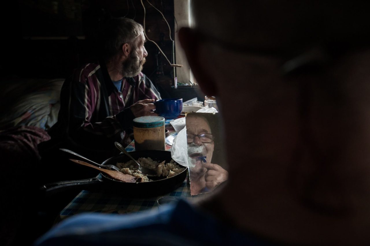 Николай бреется утром рядом с обеденным столомФото: Михаил Доможилов для ТД Без дела в Хирвисалми не посидишь, даже если захочешь. Конь Ветерок, которого Коля завел вместо съеденного, требует еды и ухода. Ездить на нем Коля не может — болят ноги, держит для души. А вот козы дают молоко, и за ними тоже нужен уход. Еще надо рубить дрова, носить воду, косить траву летом и убирать снег зимой. Помыться и постираться в бане по-черному — целое мероприятие. Выбраться на охоту и рыбалку — тоже. Чтобы расслабиться, отшельник пьет водку, настоянную на алоэ. Мутная жидкость в двухлитровой банке пахнет гадостью, но Коля с Сашей пьют и причмокивают. «Не магазинная эта ваша, а натурпродукт!»