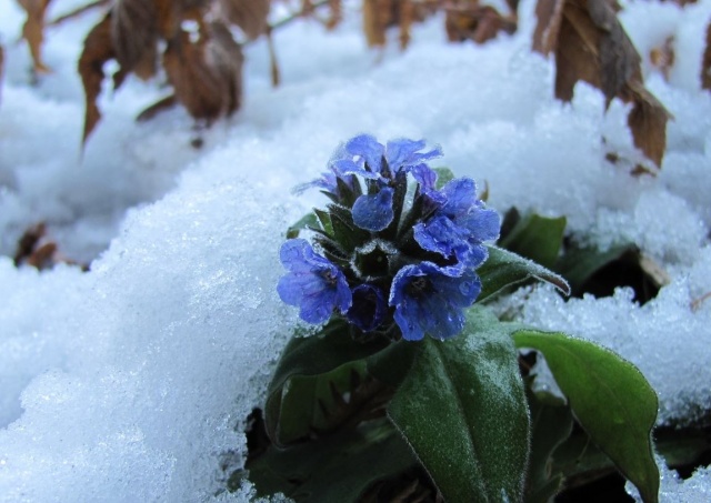 25 сентября в Нарыме зацвела незабудка. Однако из-за ночного снега цветы стали нежно-фиолетовыми.