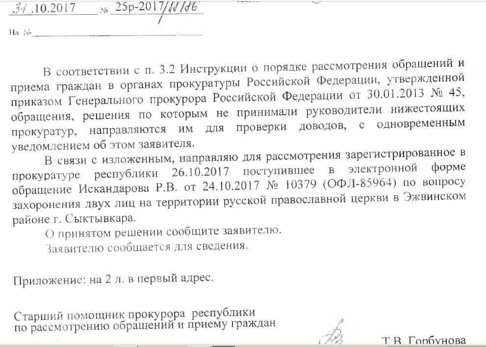 Мной подано заявление в прокуратуру о проведении проверки и возбуждении уголовного дела об оскорблении чувств верующих. Факт нарушения священником РПЦ МП законов оскорбляем мои чувства, т.к. хоронить на территории церкви никого нельзя, кроме святых. Захороненные ими не являлись.