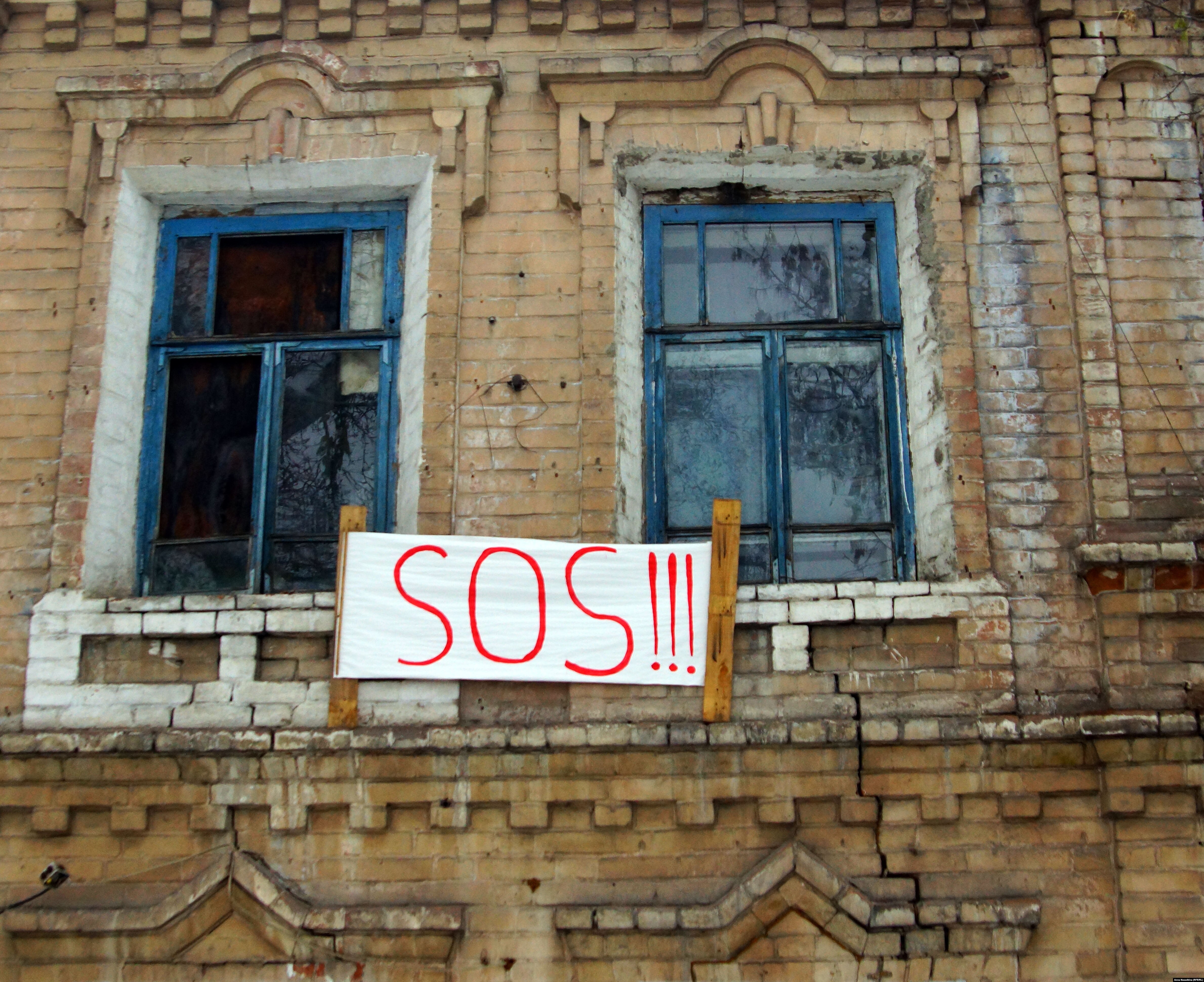На фасаде дома приколочен плакат, большие красные буквы: "SOS!" С другой стороны здания мотаются на ветру обрывки еще двух плакатов, их повесили тут летом, на День города. На одном было написано: "Помогите! Мы заложники этого памятника", на другом: "Позор администрации!"