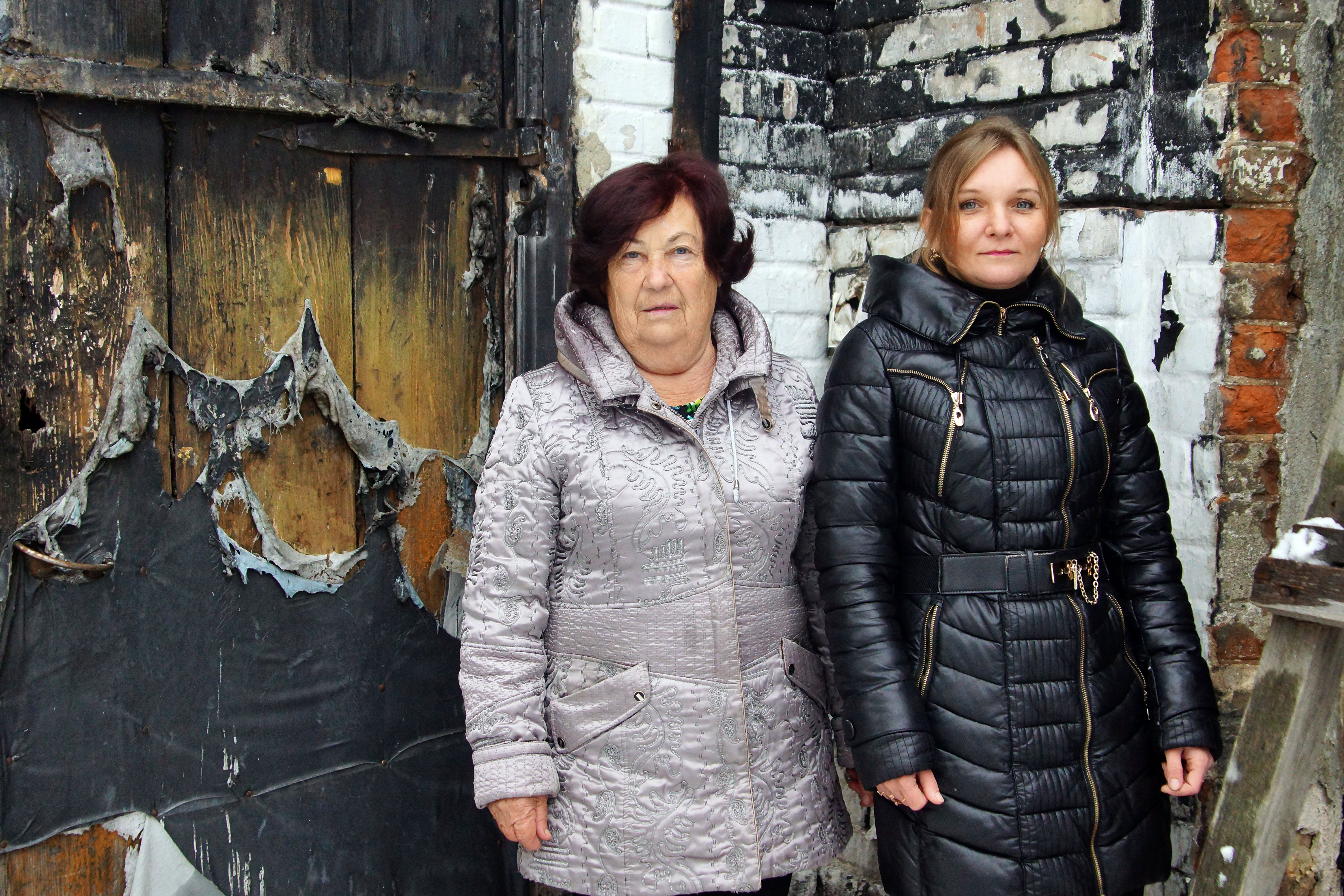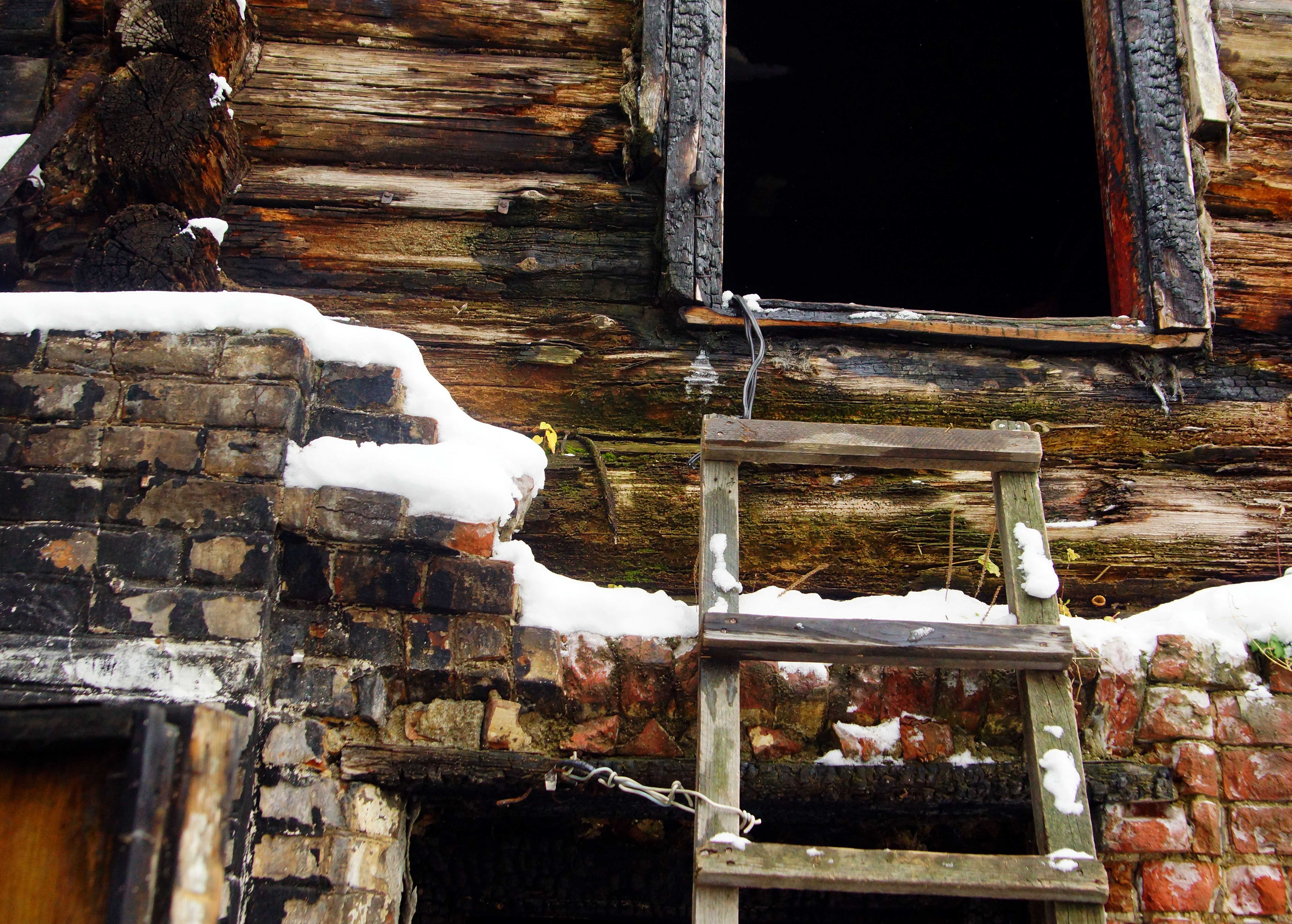 Вторая семья, оставшаяся в доме, – пенсионеры Людмила и Александр Вечкины. Их квартира расположена на втором этаже, и чтобы туда попасть, приходится карабкаться по приставной лестнице (пристройка-подъезд сгорела). Старики уже не раз падали с этой лестницы, получали травмы, приходилось вызывать скорую. Сейчас Людмила Евдокимовна живет в брошенной квартире на первом этаже. Дядя Саша, как зовут ее мужа соседи, продолжает жить наверху. Продукты, дрова для печки поднимает на веревке.