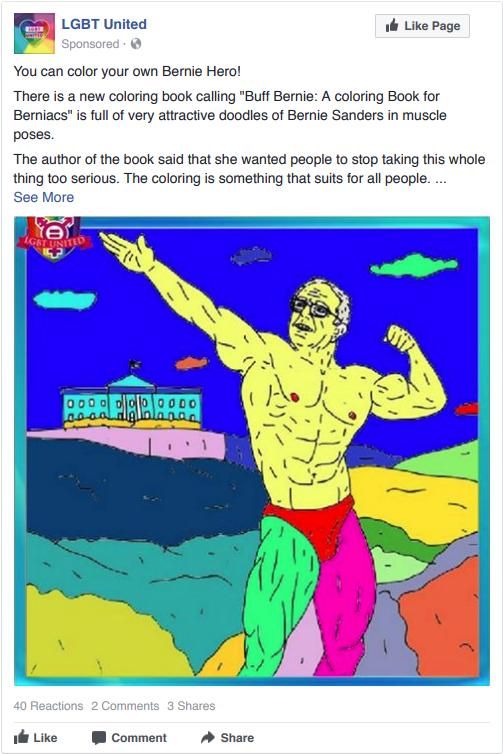The United States House of Representatives Пост: «Сегодня у американцев есть возможность выбрать президента с благочестивыми моральными принципами. Хиллари — Сатана, ее ложь и преступления доказывают, какое она зло. И даже если Дональд Трамп не совсем святой, в конце концов он честный человек и он глубоко переживает за эту страну. Я отдаю свой голос ему!» Надпись на картинке: «Сатана: „Если я выиграю, Клинтон тоже выиграет“ Иисус: „Не выиграет, если я вмешаюсь“. Ставьте лайк, чтобы помочь Иисусу выиграть».The United States House of Representatives Пост: «В Южном Техасе пограничники задержали нелегального иммигранта из Гондураса, который ранее был осужден за изнасилование и депортирован. Спасибо политике Обамы и Клинтон, нелегалы приезжают сюда, потому что ждут обещанной амнистии. Американское правительство выбрало неверный курс, но все эти политики слишком далеки от границы, чтобы увидеть кто именно нелегально пробирается через нее. Насильники, торговцы наркотиками и людьми, и другие. Процент невинных бедных семей, стремящихся к лучшей жизни, очень мал, чтобы стать доводом в пользу амнистии и техасского горячего приветствия» Надпись на картинке: «Не связывайтесь с техасскими пограничным патрулем. Всегда с Богом».The United States House of Representatives «Ты можешь раскрасить своего собственного героя Берни! В этой новой раскраске „Качок Берни: раскраска для Бернианцев“ полно очень классных дудлов с Берни Сандерсом в позе культуристов . По словам автора раскраски, она хотела, чтобы люди перестали так серьезно к этому относиться. Раскрашивание — это то, что подходит всем…»The United States House of Representatives «Именно так наши дети должны быть взращены. Это не пропаганда насилия. Это пропаганда уверенности и возможности…»The United States House of Representatives «Данни Уилльямс, 30 лет, c 1999 года пытается доказать, что он внебрачный сын бывшего президента Билла Клинтона и чернокожей секс-работницы из Литл-Рок, штат Арканзас».