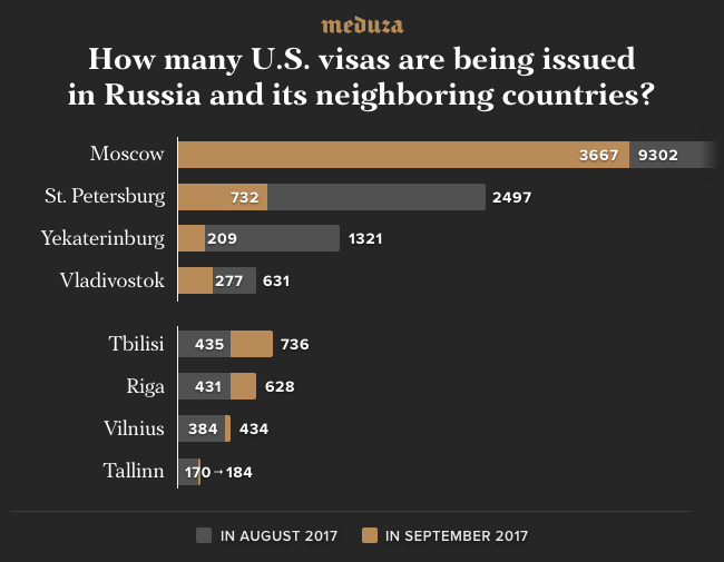 On September 1, the United States dramatically cut the size of its diplomatic staff in Russia, as demanded by the Foreign Ministry. For ordinary Russians, the direct consequence of the reduction has been a de facto tightening of the U.S. visa regime. People living far from Moscow can no longer get American visas at their nearest consulate, and applicants in the capital are waiting far longer than before. Many Russians now prefer to apply for U.S. visas in neighboring countries, and Meduza has learned that the American embassies just outside Russia are struggling to manage the new influx of eager travelers.