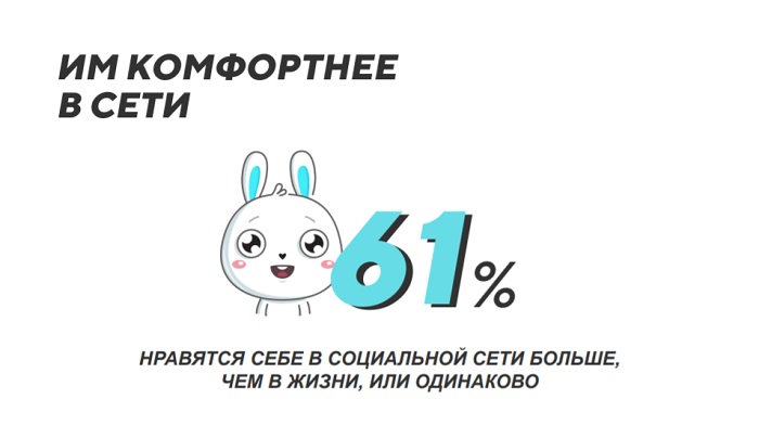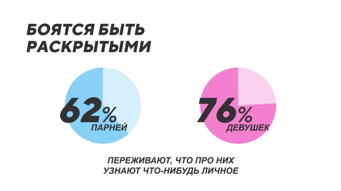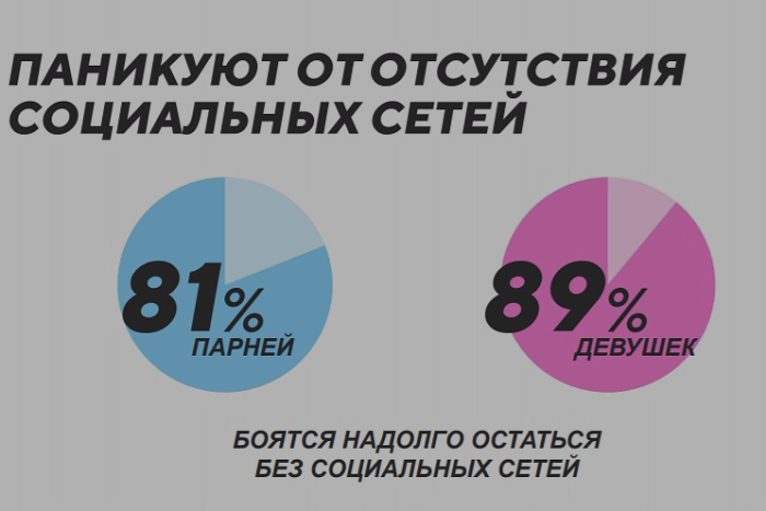 Исследование показало, что 81 % опрошенных молодых людей и 89 % девушек боятся надолго остаться без социальных сетей. 79 % молодых людей и 69 % девушек регулярно публикуют записи «ВКонтакте».