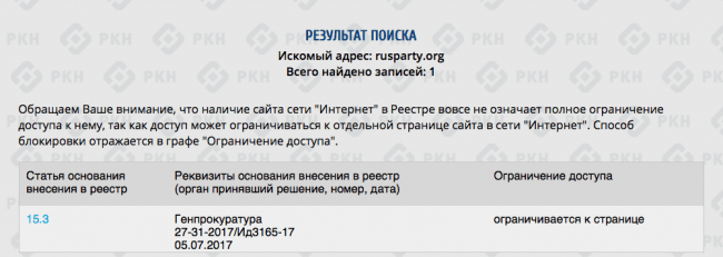На сайте Роскомнадзора указано, что основанием для ограничения доступа стала статья 15.3 ФЗ «О защите информации». Она позволяет закрывать страницы, содержащие призывы к массовым беспорядкам, осуществлению экстремистской деятельности, участию в мероприятиях, проводимых с нарушением установленного порядка.