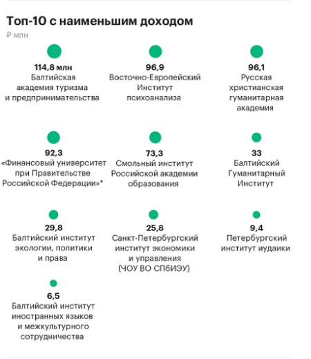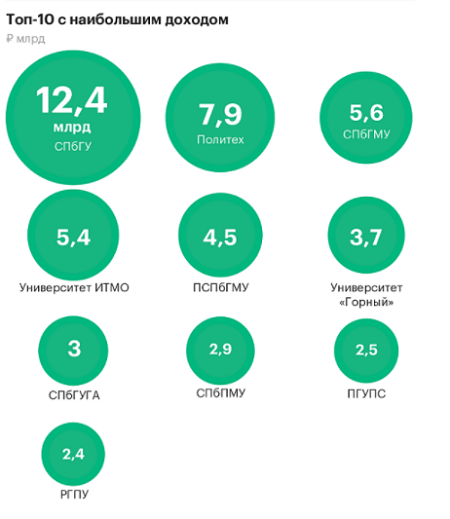 Авторы исследования также выяснили, сколько зарабатывают петербургские вузы, и составили топ-10 самых богатых учреждений и топ-10 вузов с наименьшим доходом. Совокупный заработок университетов в 2016 году, по данным НИУ ВШЭ, составил 82,5 млрд рублей.