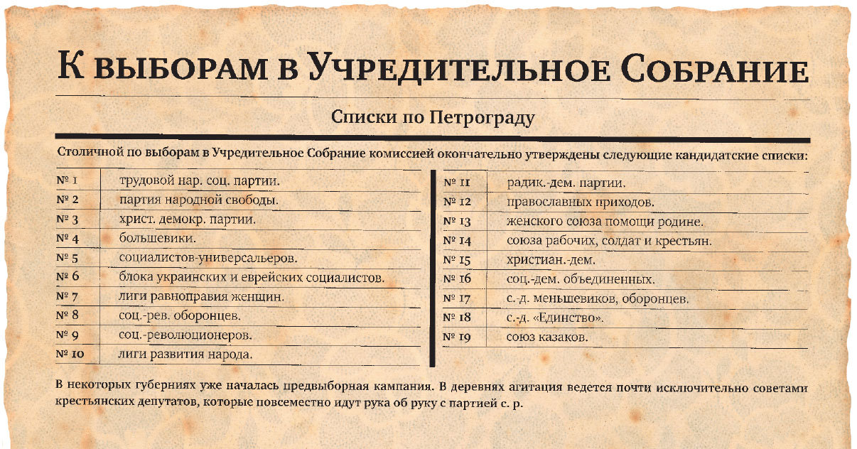 Общество ждет Учредительного собрания и, кажется, будет верить в его реальность, в то, что Россия еще обустроится демократическим путем, вплоть до большевистского декрета от 6 января. А всю осень и начало зимы спорят о программах и списках, среди которых список № 4, партия большевиков, не получает большинства голосов.