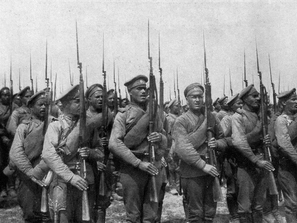 Русская пехота в строю. 1917 George H. Mewes 7 ноября (25 октября по старому стилю) исполняется сто лет российской революции, которая получила название Октябрьской. Временное правительство, управлявшее страной после Февральской революции, было свергнуто и власть перешла к большевикам, провозгласившим ликвидацию капитализма и начало перехода к социализму.