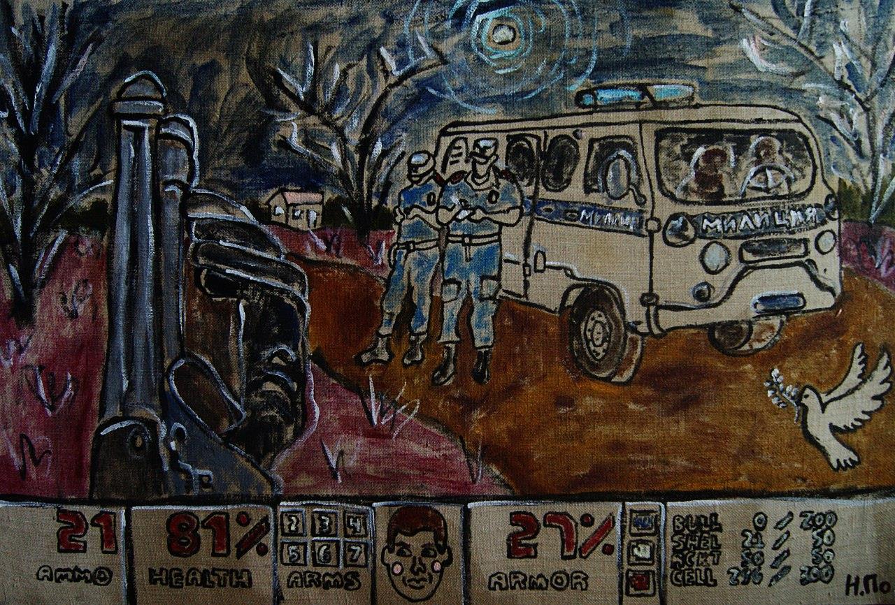 – Люблю символику, – пожимает плечами художник, – кресты, значки, эмблемы типа "адидас", "найк", серп и молот: все из одной оперы. Над всем можно и нужно шутить: сексуальными наклонностями, национальностями, идеологией. Над смертью. У людей масса энергии уходит на то, чтобы ее не замечать. Боятся. А надо с нею разобраться, и будет проще. Шутить на эту тему, фотаться с покойниками. У подруги дядька умер, так я с ним селфачей наделал. Разбираюсь. В серии работ про чеченскую войну, например, ставил задачу не показать ее ужасы другим, а понять для себя. Ты ведь всегда решаешь какую-то внутреннюю задачу, искусство – просто побочный продукт самопознания. Большинству – 95 процентам, наверное, в России – оно не нужно. Когда человек думает об искусстве? Когда есть хлеб, крыша над головой… Да и думать мало кто хочет, а картинка – это как раз повод для размышлений. Когда выставка была, ребята с мебельной фабрики как раз днюху праздновали, шашлыки жарили. Увидели, что народ идет, тоже зашли. Понравилось – один даже скульптурку купил за тысячу рублей. Правда, тут же сломал, пьяный. А обычно-то реакция: "У меня ребенок лучше нарисует".
