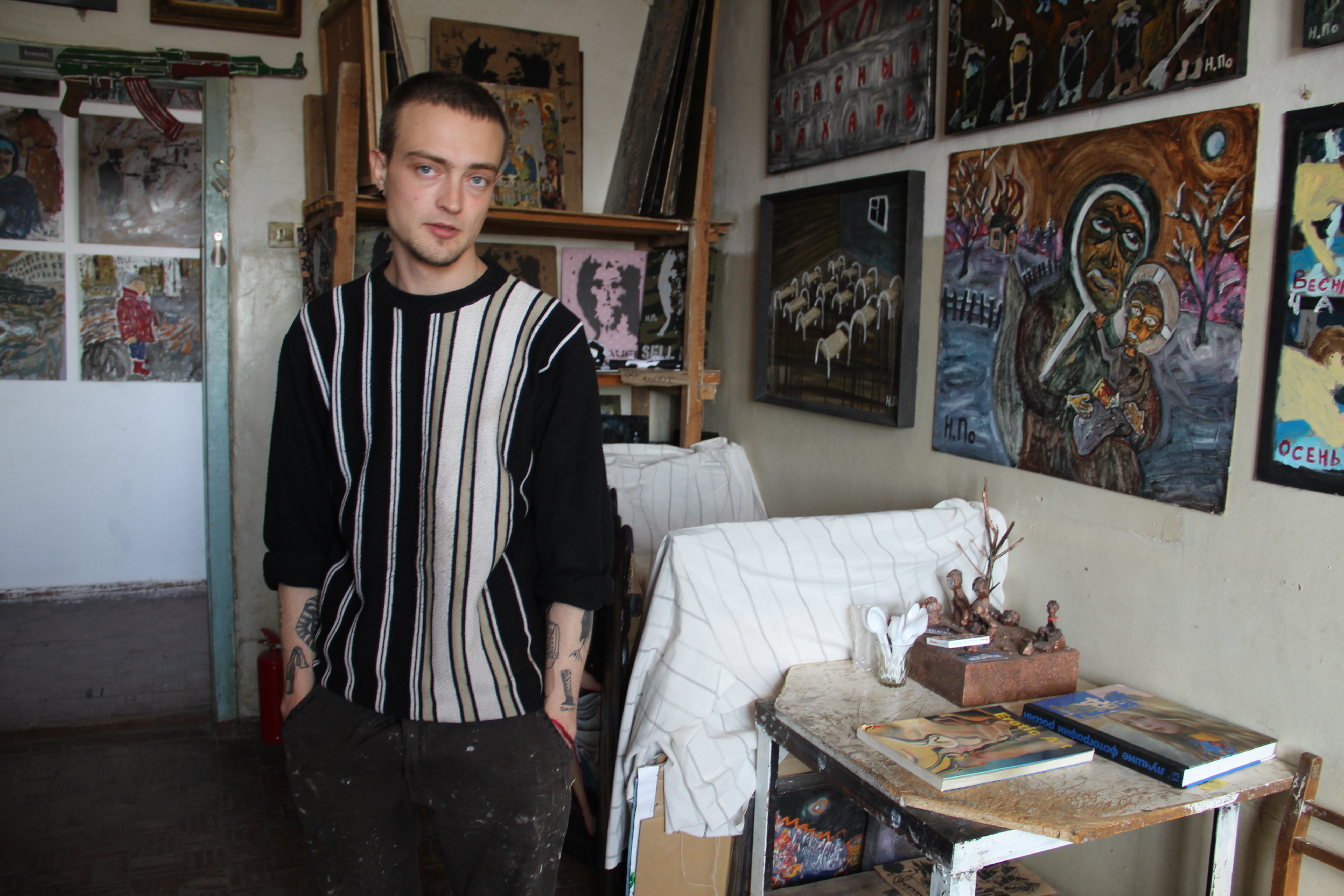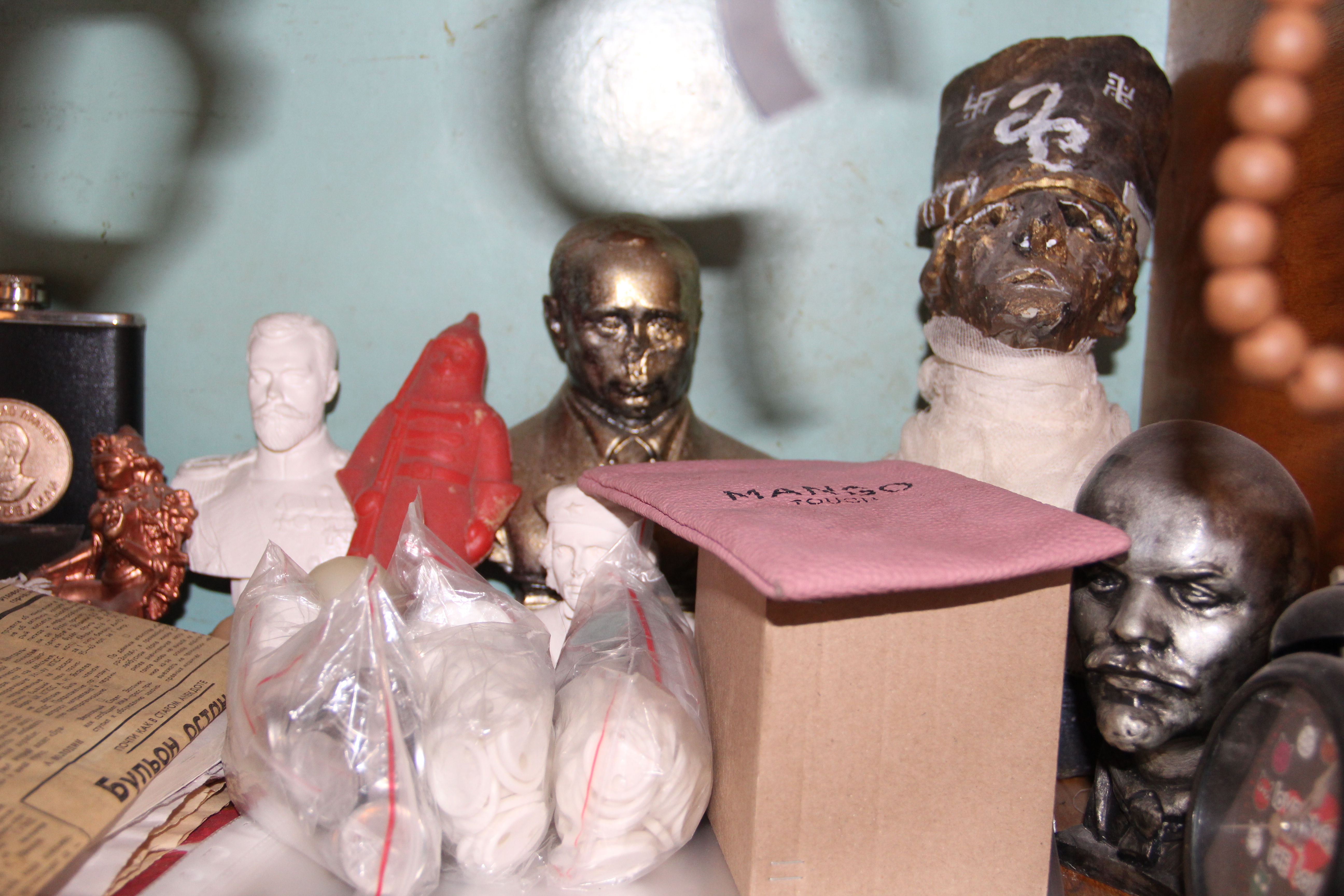 – А не опасно так шутить? – показываю на полочку, где среди слегка покореженных статуэток затесался бюст Путина с отбитым носом. Никита смеется: