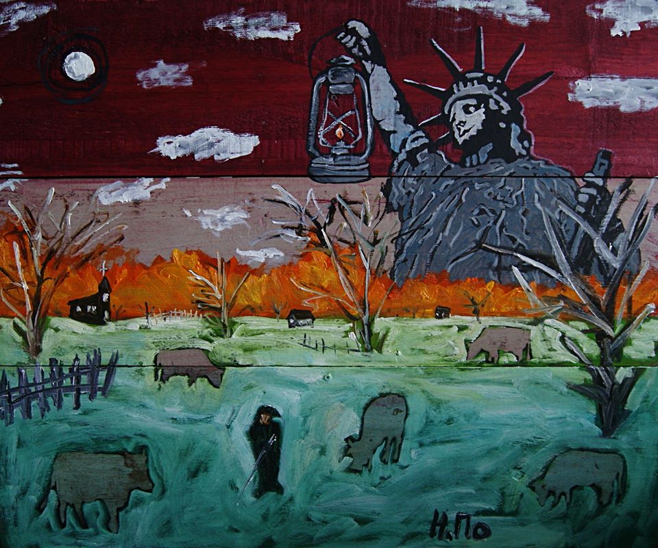 – У меня все есть, что для жизни надо, – краски, компьютер, даже душ. Три банки фасоли, крупы навалом – на распродаже купил. Холодильника нет, но зимой будет за окошком. Я счастливый человек. А техника мне не нужна. Не люблю учиться. Когда учатся, все одинаковые выходят. Учеба не сделает тебя художником, она сделает таким же, как твой преподаватель. Матрешки, ложки, портреты, пейзажи – это не искусство, это ремесло. А рисовать надо по доброй воле. Как в туалет ходишь – накопилось желание, надо выплеснуть из себя. Когда себя заставляешь, одно мучение, и это видно по картинке. Если есть у меня настроение, нарисую за полчаса. Быстро и хорошо. Картинка должна быть простой, простота всегда сильнее. Рисую все, что придет в голову. Не знаю, откуда берется – из пространства, наверное. Художник – как самогонный аппарат: накапливает впечатления, конденсирует и выливает как произведение искусства. Мой друг Дима Вирже говорит, что идеи нам присылают демоны. Ну, не ангелы точно, с ангелами мы не общаемся. Они же скучные, как учителя в школе. Вот педерастов старых нарисовал. Почему, не знаю. Веселые. Может, они и не педерасты вовсе, может, просто из бани.