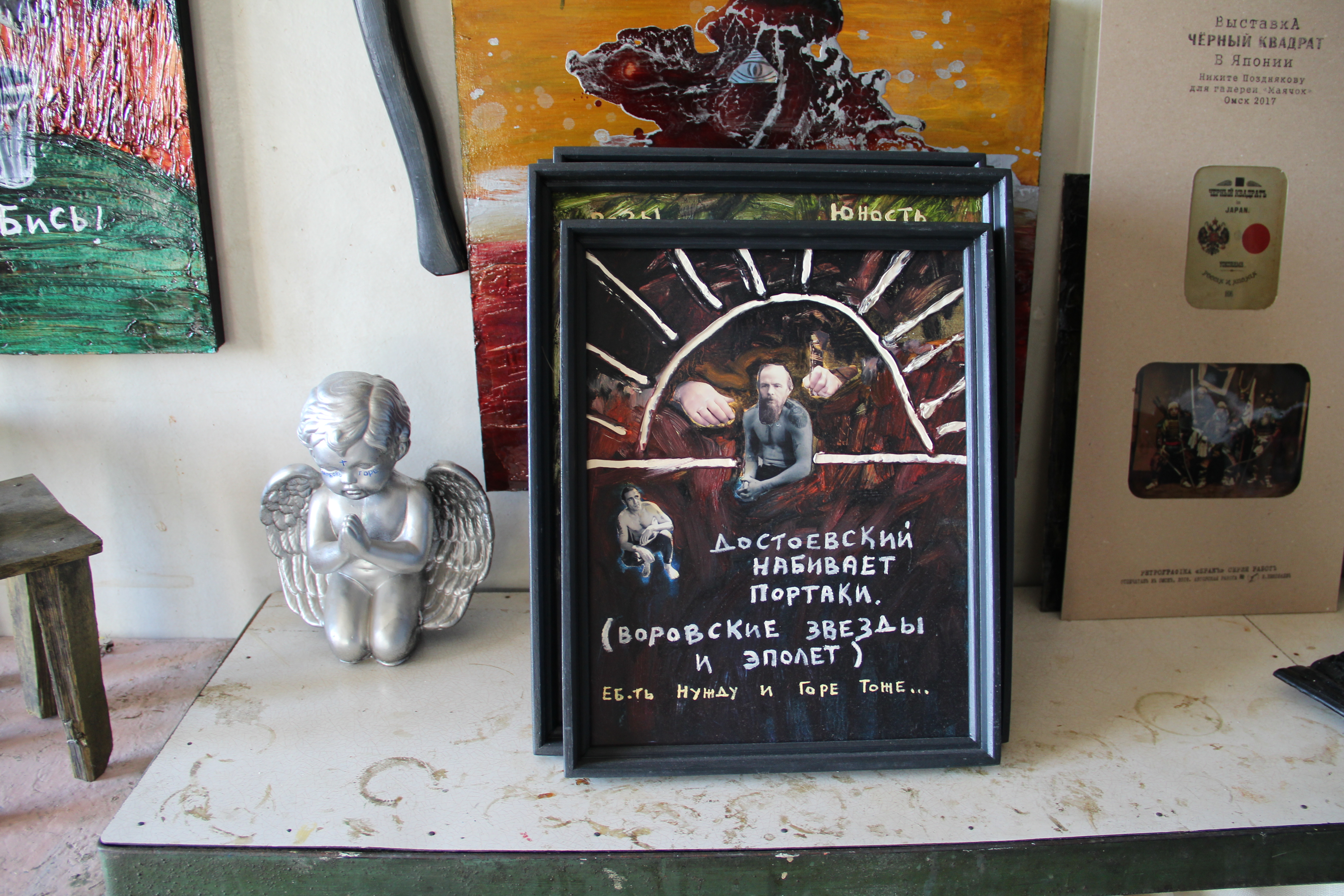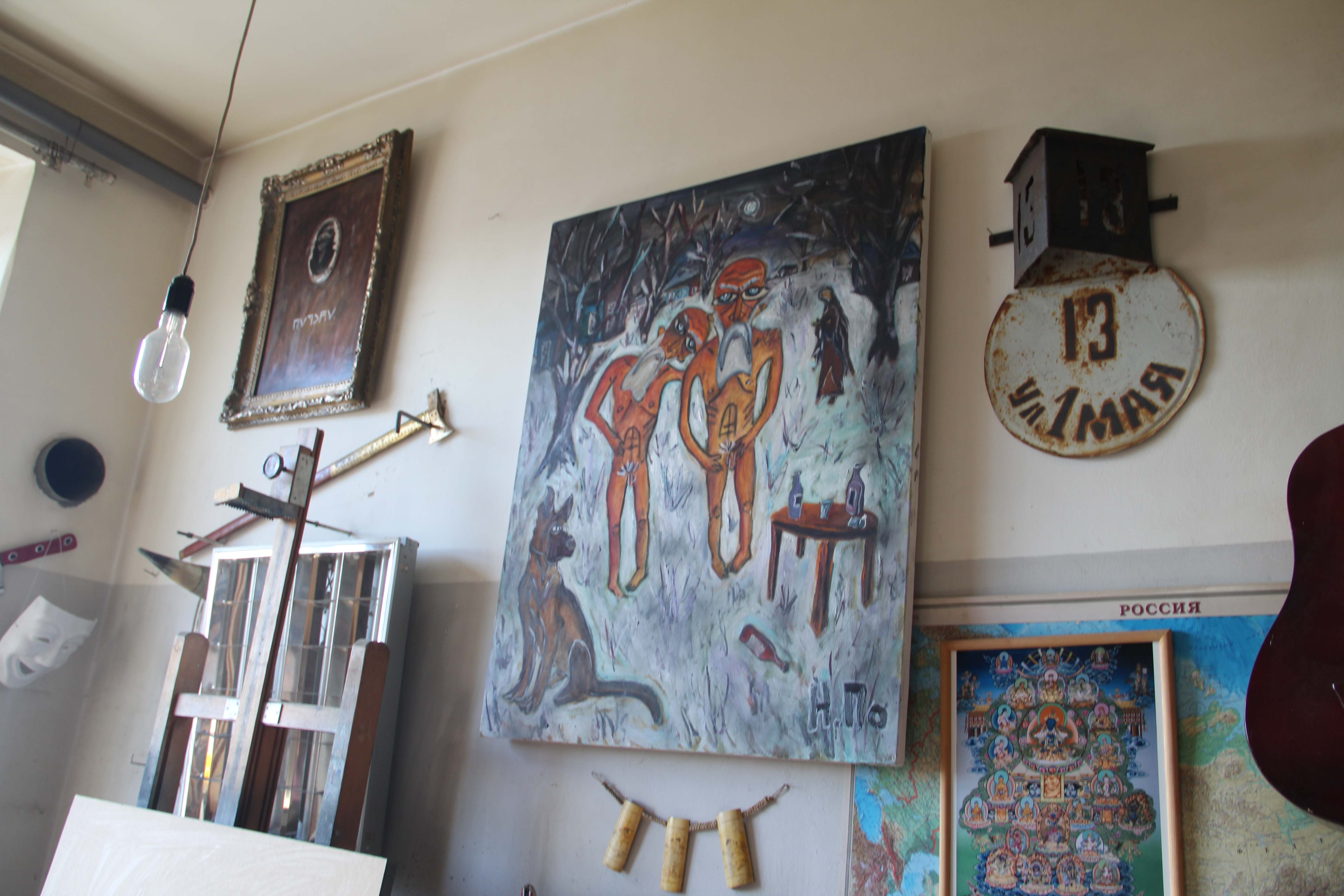 – И коридор, – добавляет художник. – Тут же не только мои работы, а места мало. Приходят люди, смотрят, мы выставки проводим. Немного, конечно, – человек 150 на миллионный Омск. Художники, студенты в основном. Не за раз, но лица всегда одни и те же. Покупают не омичи, конечно, у кого в Омске деньги есть? Москвичи, реже – питерцы. После того как мне штраф за экстремизм дали, новые какие-то клиенты появились. Это же игра такая. Можно не уметь рисовать, главное – уметь мистифицировать. Говоришь, что ты художник, и все верят, приходят интервью брать. Но я искренне играю.