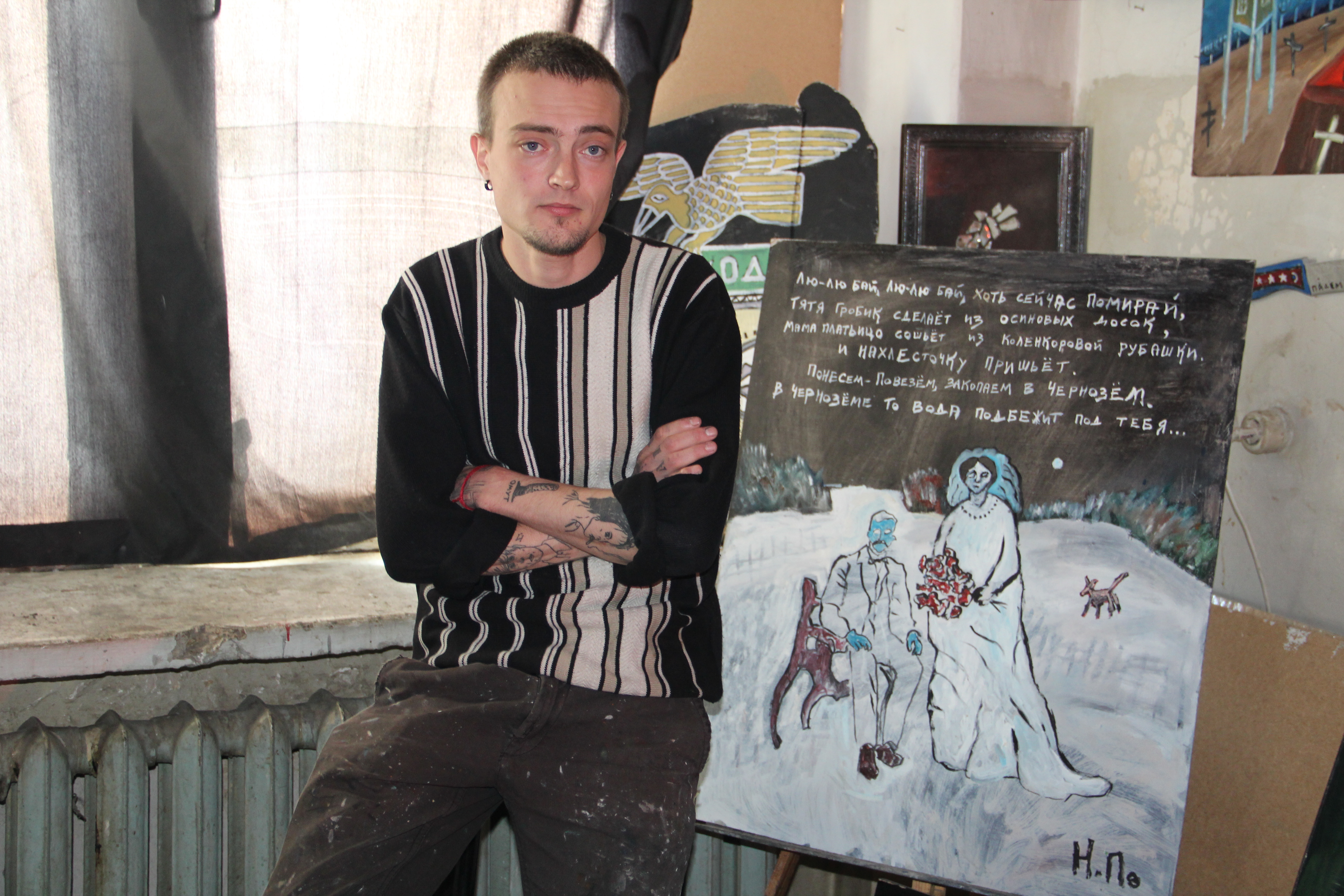 – До этого в школу ходил, на кладбище работал менеджером – памятники продавал. Там хорошо заработать можно – в сезон тысяч 40–80. Ну и вообще: дорожки, лес – спокойно. Отец у меня художник: классика, пейзажи всякие. А мне неинтересно было. Никогда не хотел никем быть, никогда не хотел работать. Фальшь мироустройства всегда чувствовал. Нас всех с детства готовят к определенной жизни: девочки – домохозяйки, мальчики – бойцы. На самом деле все люди – потенциальные гении, если могут услышать себя. Просто и образование, и воспитание сводятся к тому, чтобы сделать нас приемлемыми членами общества: закончить школу, институт, найти хорошую работу. Многие проживают чужую жизнь, так и не поняв этого. Памятник из металлокерамики – медаль за серое существование. За яркое – из гранита. Но вопрос не в стоимости, а в том, жить в удовольствие или постоянно преодолевать какие-то барьеры, чтобы быть "не хуже других", "как люди". Я делаю то, что нравится. Сегодня мне нравится рисовать, завтра – не знаю. Не строю планов.