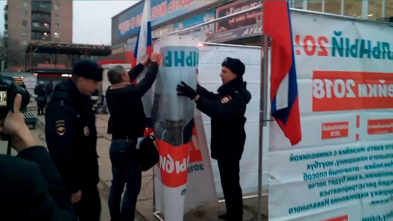 Чернов и Кузьмин развернули квадратный баннер и достали газеты. Это было не совсем то, чего ожидала полиция — поэтому почти до конца пикета люди в форме вели переговоры между собой и по телефону. Наконец, полицейский всё-таки подошел к организатору и попросил свернуть агитацию, говоря что-то о «незаконной политической рекламе». Поскольку время и так было на исходе, активисты штаба без лишних споров свернули баннер и покинули площадку.