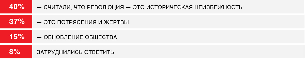 Больше половины респондентов (57%) считают, что революция — это «историческая неизбежность», у которой есть свою плюсы и минусы. Каждый четвертый (25%) уверен, что это «потрясения и жертвы», еще 11% опрошенных назвали революцию «обновлением общества».