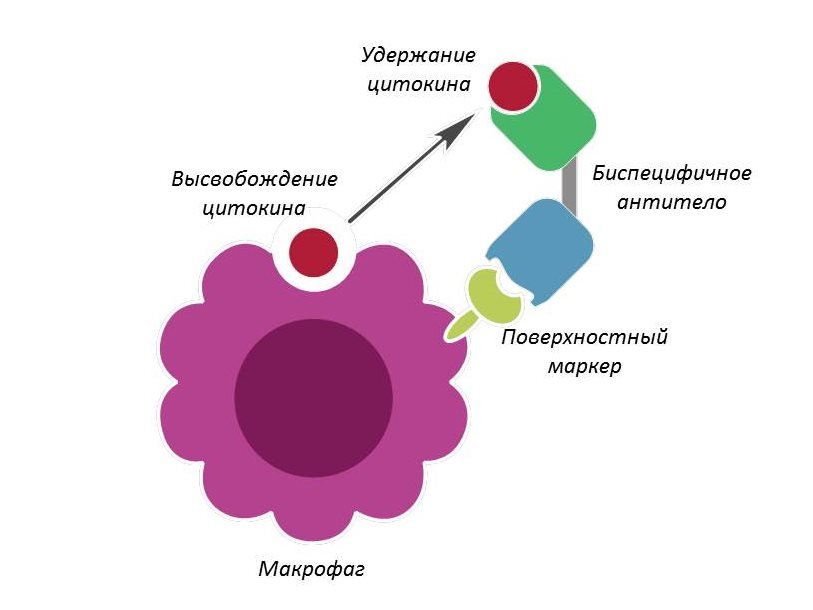 «У нас были созданы так называемые биспецифичные антитела. Это значит, что они умеют связывать два типа молекул. Одной “рукой” они цепляются за клетку и связывают поверхностный маркер, например на макрофаге, а второй “рукой” они захватывают тот самый цитокин, который эти клетки продуцируют. Соответственно, этот цитокин вместо того, чтобы системно попадать в кровоток и вызывать аутоиммунитет, просто сидит на поверхности макрофага и там удерживается и блокируется», – заключила Марина Друцкая.