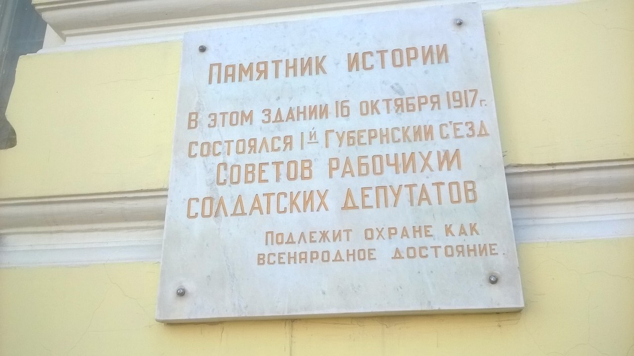 Второй памятник – “дом исполнительных комитетов” (ул. Подбельского д. 2). Это здание дворянского пансиона построено в 1913-1916 гг., но отделка здания не была окончена и дети дворян, обучавшиеся в мужской гимназии, здесь никогда не жили. В апреле-мае 1917 г. здание самовольно отнято у дворянства под нужды общественных организаций – Временного губернского исполнительного комитета Временного правительства, Совета рабочих депутатов и созданного в мае 1917 г. Совета крестьянских депутатов (он занимал 3-й этаж). Здесь же находились различные секции и комитеты советов, велись курсы по просвещению, работали библиотеки. Недавно поновленная мемориальная табличка сообщает, что здесь прошел Губернский съезд Советов, взявший курс на взятие власти в свои руки. После октябрьского переворота здесь находился Губернский совет и его исполком, затем в 1918 г. комитет снабжения, и в 1920 г. сюда переехало почтово-телеграфное ведомство. В 1923 г. , видимо, по инициативе его рабочих Троицкая улица была переименована в улицу народного комиссара почт и телеграфов Подбельского.