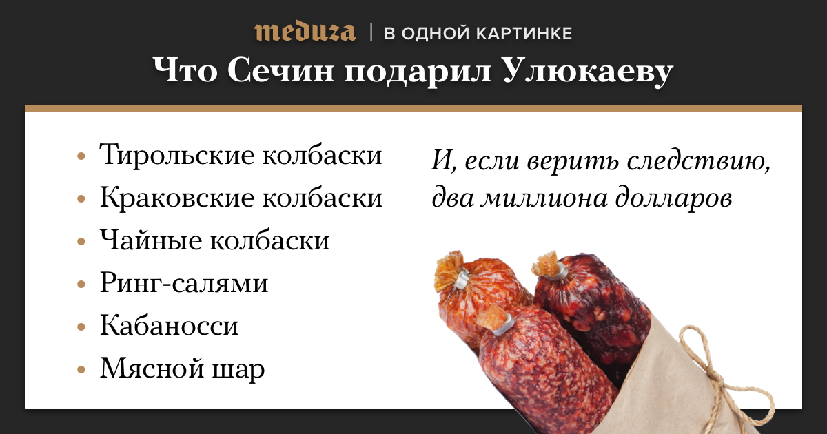 На заседании суда по делу бывшего министра экономического развития Алексея Улюкаева сторона защиты зачитала список содержимого корзины, с которой глава «Роснефти» Игорь Сечин якобы передал ему взятку. Судья прервал адвокатов, поэтому это неполный список. Кстати, колбасу, переданную Улюкаеву, уже уничтожили по решению суда.