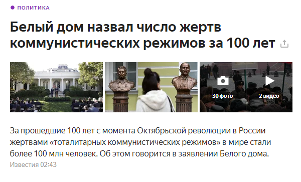 Плюс еще одна странность. США последние десятилетия страны просто уничтожают, в принципе не считаясь с потерями мирного населения. Но никто не считает сотни миллионов жертв США за последние сто лет, не озвучивает эти цифры.