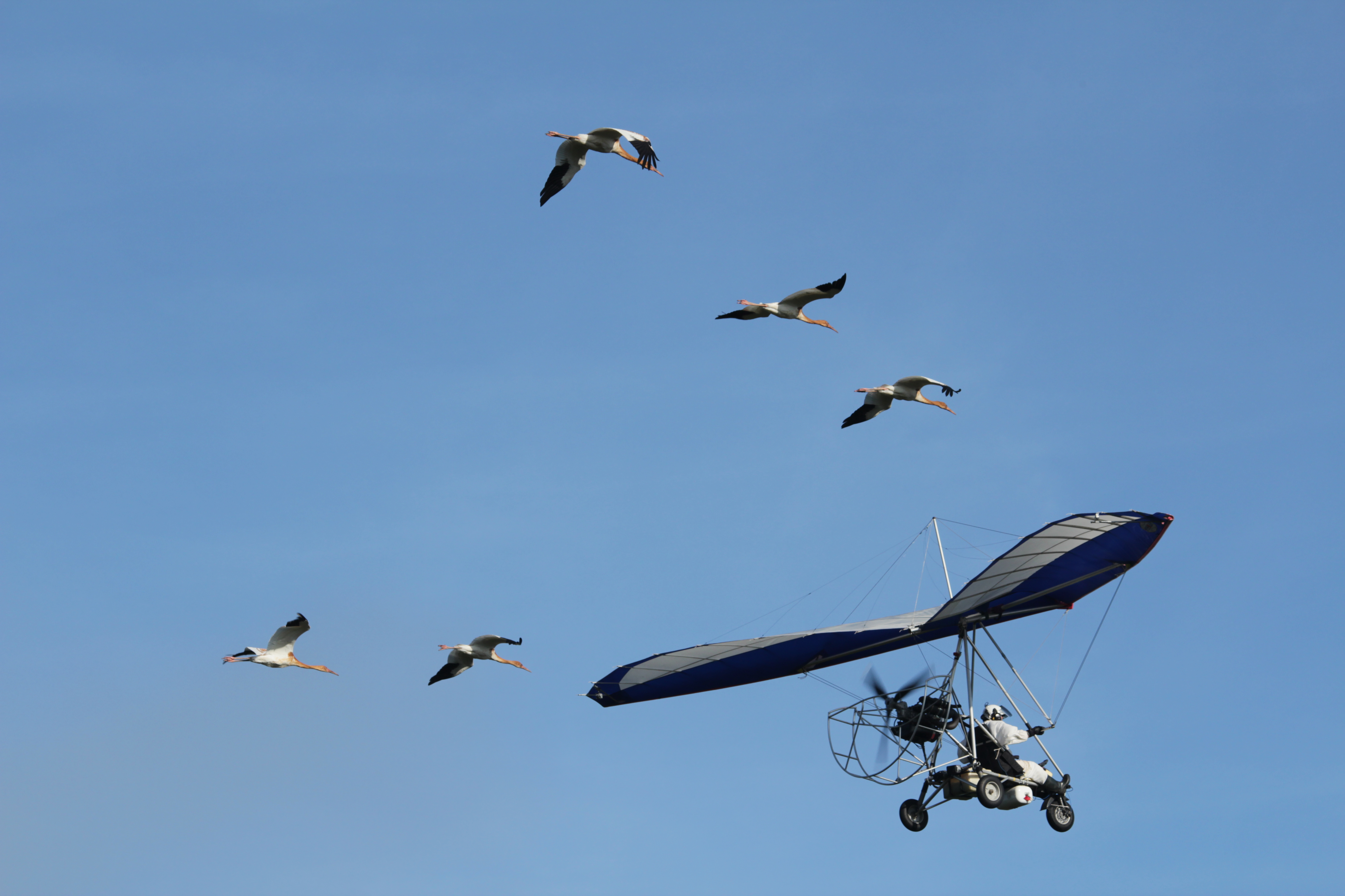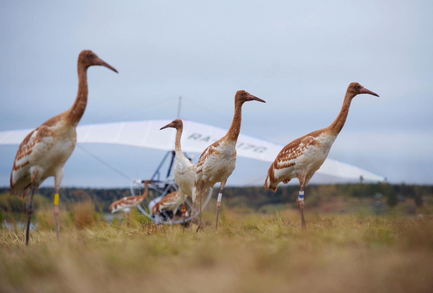 Подобный проект предполагалось реализовать и в России. Первая попытка использовать дельтаплан для сопровождения журавлей к местам безопасной зимовки была сделана в 2002 году легендарным итальянским пилотом Анджело Д’Арриго, который до этого летал с орлами над Средиземным морем и над Сахарой. По приглашению российских ученых он прибыл в Окский заповедник, где стерхов разводили еще с восьмидесятых. Совсем юных птенцов научили воспринимать дельтаплан в качестве вожака стаи, и они пролетели вслед за ним от заказника Кушеват на Ямале до Белоозерского заказника, расположенного в Тюменской области. Здесь проводят лето серые журавли – с ними стерхи и улетели на юг. Однако оказалось, что технология требует доработки.