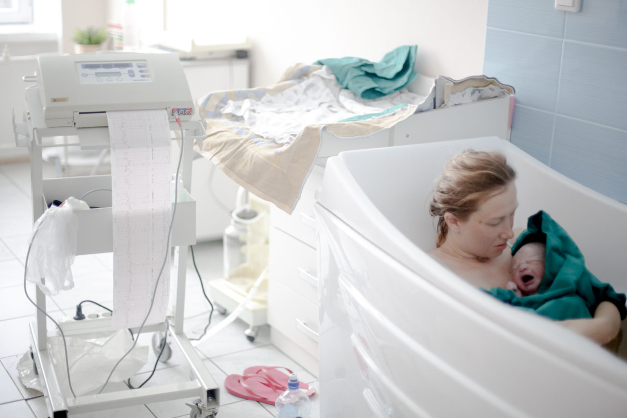 Внезапно дверь распахивается, быстро входит акушерка: «Долго лежите в ванне, вылезайте. И КТГ давно пора уже делать». Она включает свет, толкает аппарат к кровати, звук скрежещущих по полу колес — пока самое громкое, что здесь было слышно. Ее поведение совсем не похоже на то, как вел себя врач: присутствие акушерки, ее громкий голос, резкие движения странным образом мгновенно меняют атмосферу. Только что это была комната, где совершалось какое-то таинство, а сейчас это — родовой зал с пациентом, вперевалку шагающим к кровати. Даже запах эфирных масел от лампы, кажется, сменяется больничным запахом хлорки и камфоры.
