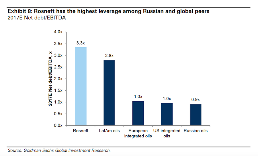 Особенности учетной политики «Роснефти» привели к тому, что сама компания и рынок теперь очень по-разному оценивают ее долговые обязательства. Например, Sberbank CIB считает, что уровень реального долга «Роснефти» далек от «комфортного» и его соотношение к EBITDA составит по итогам года не 1,7, как считает «Роснефть», а около 3. Примерно те же оценки (3,3) дает в своем октябрьском отчете Goldman Sachs, а вот Deutsche Bank в августе прогнозировал, что это соотношение в 2017 году составит 2,5. S&P на середину года оценивал его в 4.
