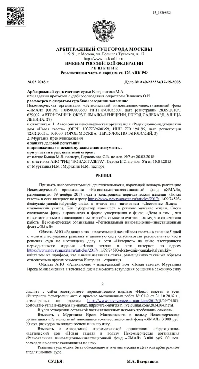 Обязать АНО «Редакционно-издательский дом «Новая газета» в течение 5 дней с момента вступления решения в законную силу опубликовать резолютивную часть решения суда по настоящему делу в сети «Интернет» на сайте электронного периодического издания «Новая газета» в сети интернет по адресу https://www.novayagazeta.ru/articles/2017/11/09/74503-dostoyanie-yamala-italyanskiy-unitaz тем же шрифтом, что и выше названная статья, размещенную таким же образом относительно других элементов Интернет-страницы.