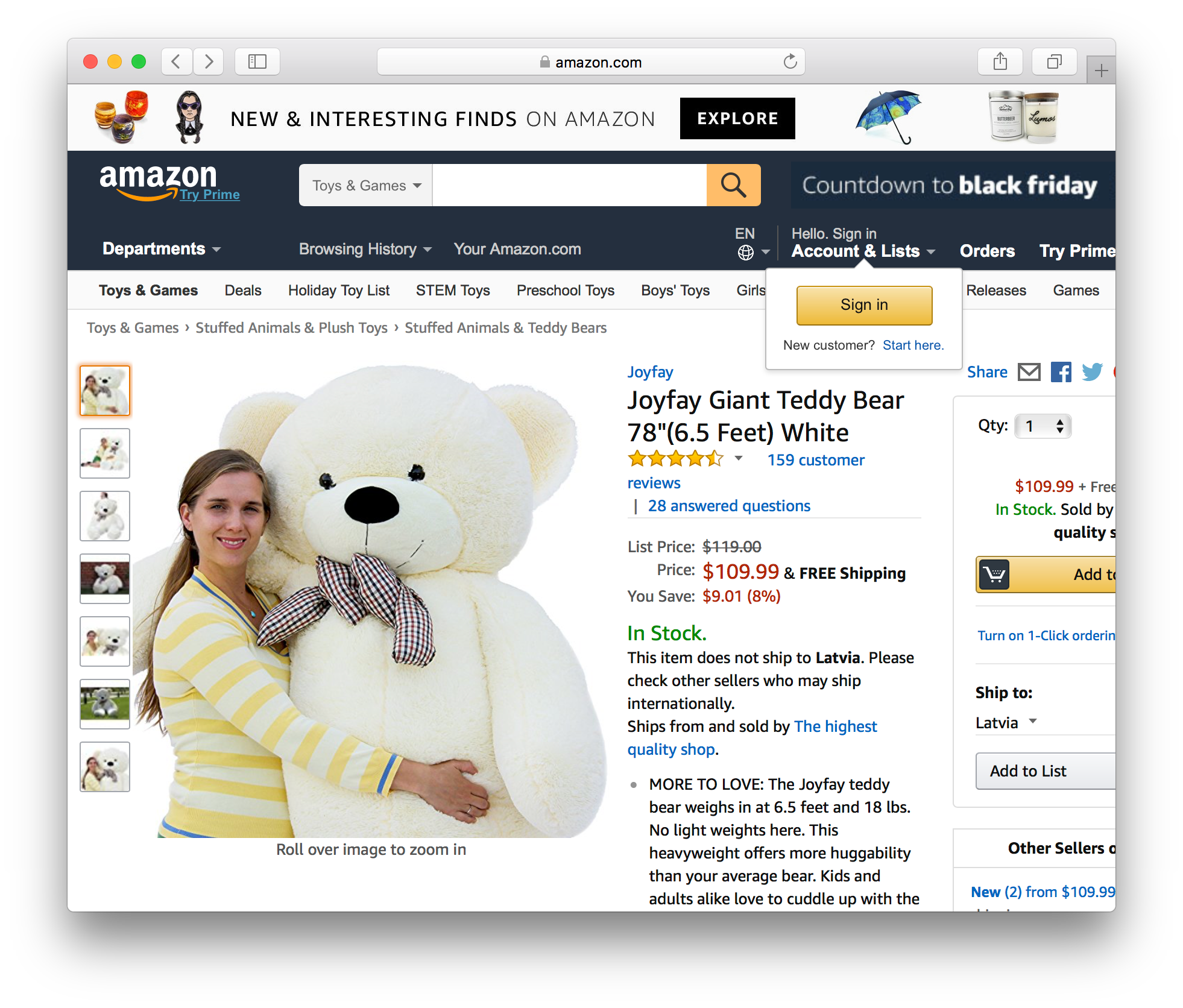Пользователи соцсетей обнаружили в интернет-магазине Amazon гигантского плюшевого медведя за 110 долларов. В описании указано, что он двухметрового роста, но не уточняется, почему же он такой высокий.