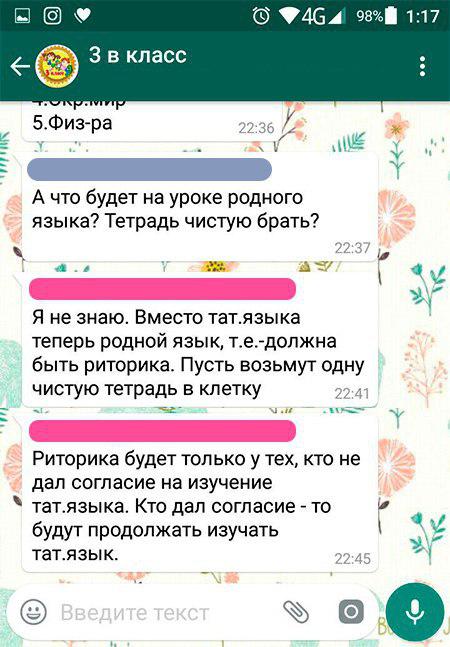 С началом новой учебной четверти школы оказались на перепутье — они не имеют четких указаний, как действовать дальше. Новости из школ разные — каждый "выплывает" по своему: многие уже сократили количество часов татарского до двух часов, кто-то выбрал дисциплину "родной язык", некоторые — краеведение вместо татарского, кто-то — второй учебный план с факультативным татарским.