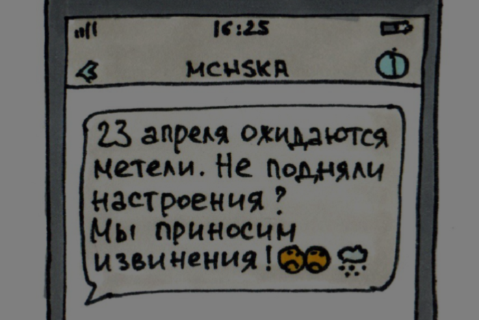 Петербургский иллюстратор Илья Тихомиров опубликовал комикс о предупреждениях МЧС. На картинках нарисован экран смартфона, где в стихах рассказывается о надвигающейся грозе и усилении ветра.
