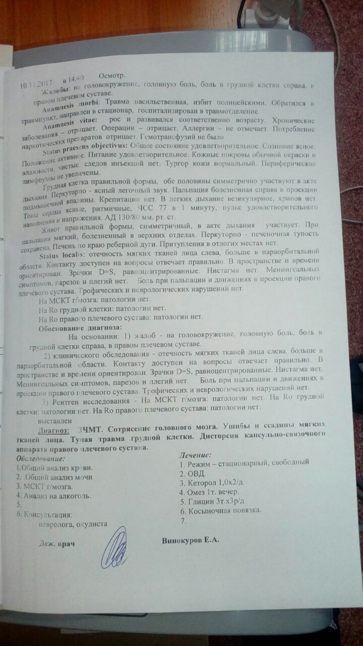 Как рассказывает пострадавший, 09 ноября, во время около 18.30, подходя к своей машине он был задержан людьми в масках. Никто не представился. Его повалили на землю, застегнули сзади наручники и закинули в микроавтобус. (Как рассказывает супруга пострадавшего, поздней, когда муж не пришел домой, она решила, что мужа похитили. Не правда ли, похоже на похищение? Как говорит пострадавший, его заставляли отвечать на звонки, когда она звонила, и, говорить, что все хорошо). В машине Айдыну нанесли несколько ударов в область почек и поясницы, после чего привезли в отдел. Сотрудники тоже учатся… Как говорит пострадавший, все были в масках, никто не представился. Чтобы не опознали? Его били и заставляли позвонить сотруднику ГИБДД по фамилии П. (Как нам стало известно, он также находится в больнице и также незаконно пострадал). Избивавшие Айдына сотрудники заставляли его передать сотруднику ГИБДД взятку в сумме 13 т. рублей за водительское удостоверение. Айдын отказывался и его били и били. Как он рассказывает, били по пояснице, по голове (по затылку). В голову били предметом обернутым в ткань (видимо, чтобы не оставлять следов). Сейчас у пострадавшего диагнострирована закрытая черепно-мозговая травма.