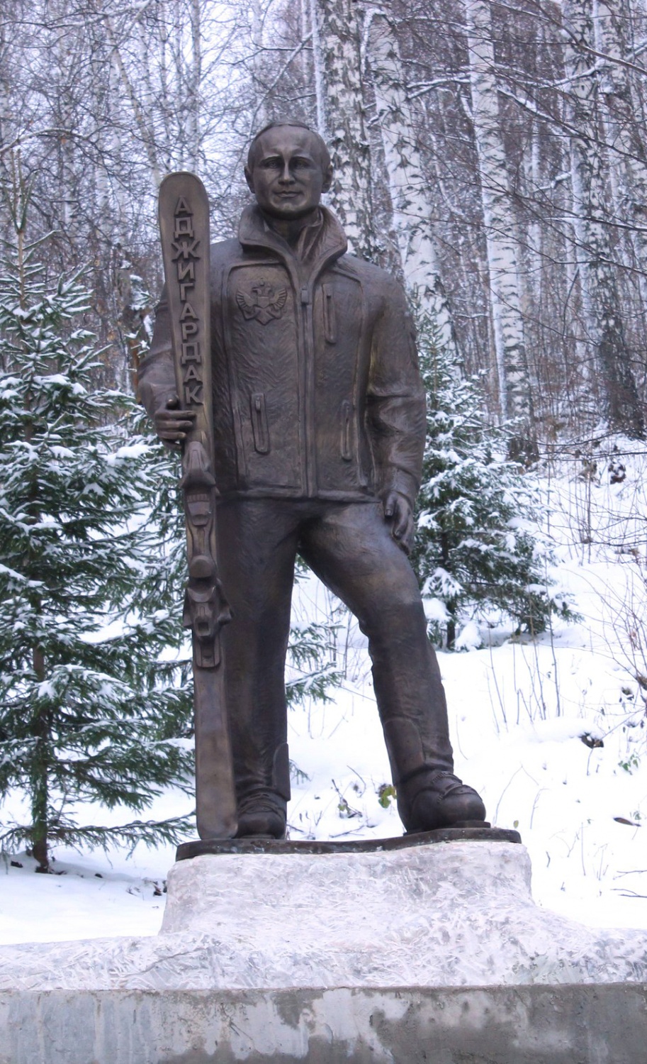 На прошлой неделе Владимир Путин побывал в Челябинске, чтобы провести переговоры с Нурсултаном Назарбаевым в рамках Российско-казахстанского форума. В тот же день, 9 ноября, на горнолыжном комплексе (ГЛК) «Аджигардак» в городе Аша Челябинской области появился свой собственный Путин — крепкий мужчина весом около полутоны и ростом 180 см, отлитый из бронзы, с лыжами в руках.