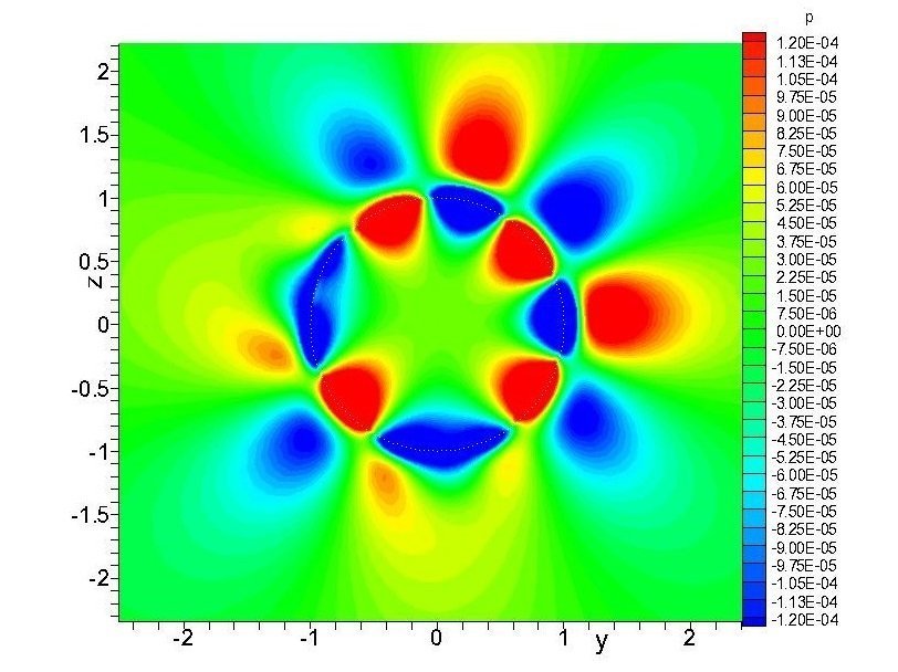 Мгновенные картины возмущений давления при развитии неустойчивости так называемого вихря Ренкина в сжимаемом газе. Это первое полное описание процесса развитии неустойчивости и излучения звука вихрем Ренкина. Задача имеет отношение к проблемам аэроакустики, направленным на снижение уровней шума. Источник: Андрей Толстых