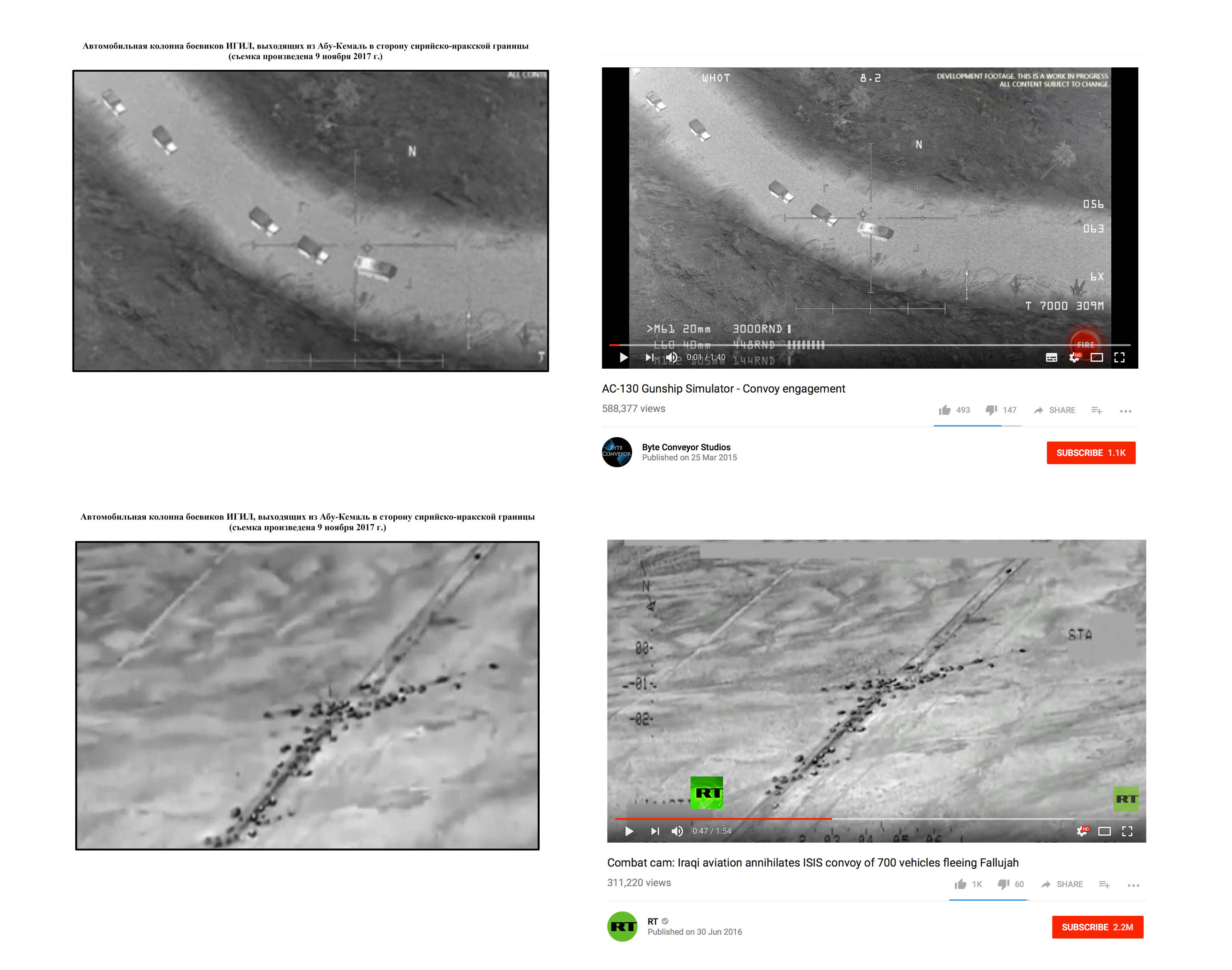 Так, изображение с подписью «Автомобильная колонна боевиков ИГИЛ, выходящих из Абу-Кемаль в сторону сирийско-иракской границы (съемка произведена 9 ноября 2017 г.)» на самом деле является скриншотом из игры для смартфонов AC-130 Gunship Simulator.