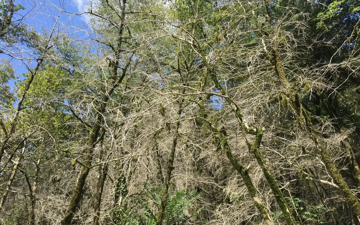 Вокруг лишь мертвые остовы самшитов со свисающими гирляндами зеленого мха. Раньше под кронами росли низкие тенелюбивые растения подлеска. Из-за гибели самшита и они засохли от прямых солнечных лучей. Как бы далеко вглубь рощи я не продвигалась, ни одного живого самшита не нашла, на многих деревьях не было даже коры. И гусениц не встретила. Все сожрали и уползли.