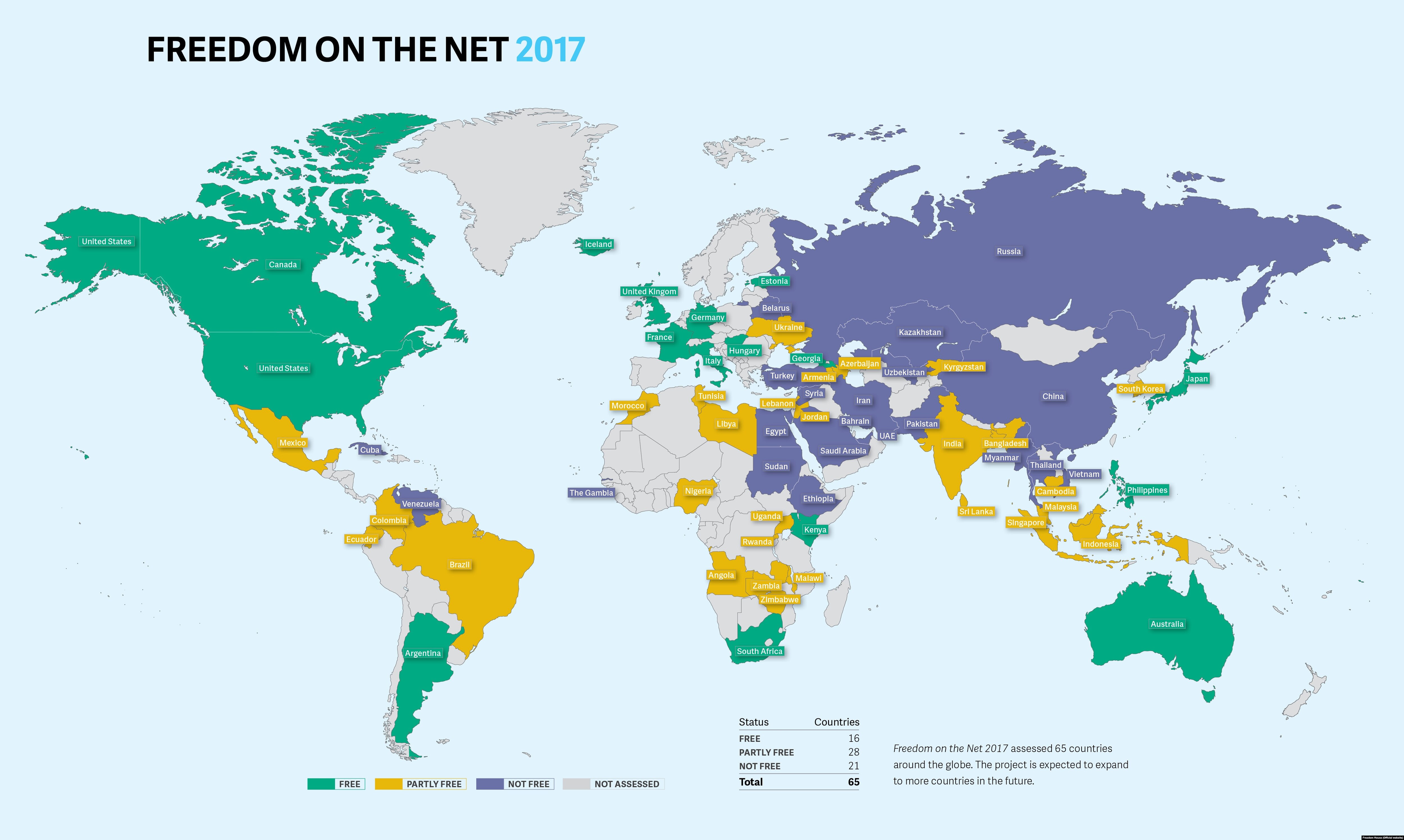 Страной с наибольшими ограничениями вновь признан Китай, а меньше всего цензуры в сети – в Эстонии. Среди бывших советских республик только в Грузии интернет получил статус "свободного" в рейтинге Freedom House. Исследователи подчеркивают, что по всему миру ситуация со свободой интернета ухудшается уже семь лет подряд.