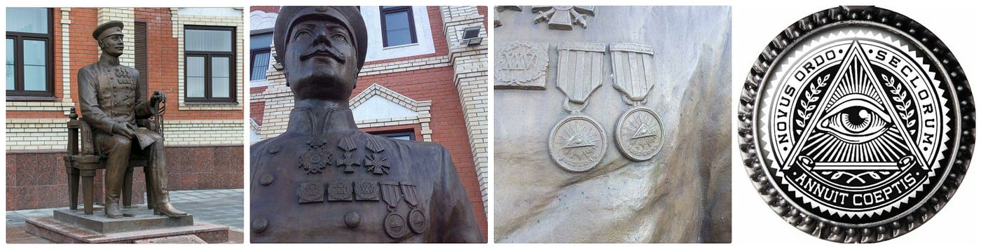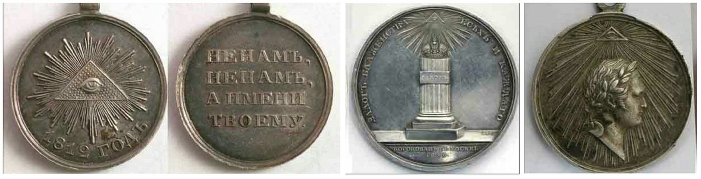 ▪▪▪ Оказывается Александр Андреевич — немецкий дворянин по происхождению, принявший российское подданство. Прежде чем его после высочайшего благословения назначили главным царевококшайским уездным начальником, он на первых парах своей блистательной карьеры принимал участие во всевозможных заграничных походах российской армии. В том числе сражался с полчищами Наполеона Бонапарта. Где бы только не воевал Келлер, всюду себя показывал бравым, отважным и исполнительным офицером. Поэтому и наградили героя медалями в память о войне 1812 года с изображениями Всевидящего Ока — лучезарной дельты. Ну, ладно. Выяснить “вскакиванье” франкмасонских символов на монументе в центре Йошкар-Олы по факту несложно — марийского административного руководителя в прошлом подобающе наградили, а мы в настоящем увековечили о нём память, детально скопировав реальный облик в твёрдый материал. Закономерно напрашивается вторая дилемма: причём тут “грозный глаз Создателя в светящемся треугольнике” в аспекте крупномасштабных столкновений всей Европы 200 летней древности? Чей взор в Марий Эл столь остро и позитивно отреагировал на эти знаки? ►