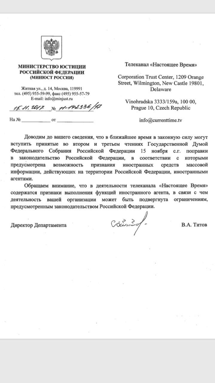 Кроме того, подобные предупреждения получили региональные проекты «Кавказ. Реалии» и «Idel. Реалии», передает ТАСС. В направленных письмах отмечается, что, поскольку в деятельности проектов «имеются признаки выполнения функций иностранного агента», то на них могут быть распространены ограничения. Ранее аналогичное предупреждение было направлено редакции «Голос Америки». Письмо «Настоящему времени» в телеграме опубликовала журналист «Ведомостей» Ксения Болецкая.
