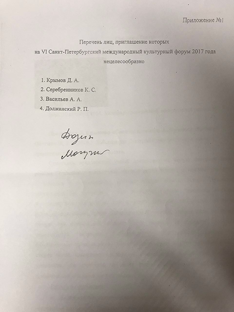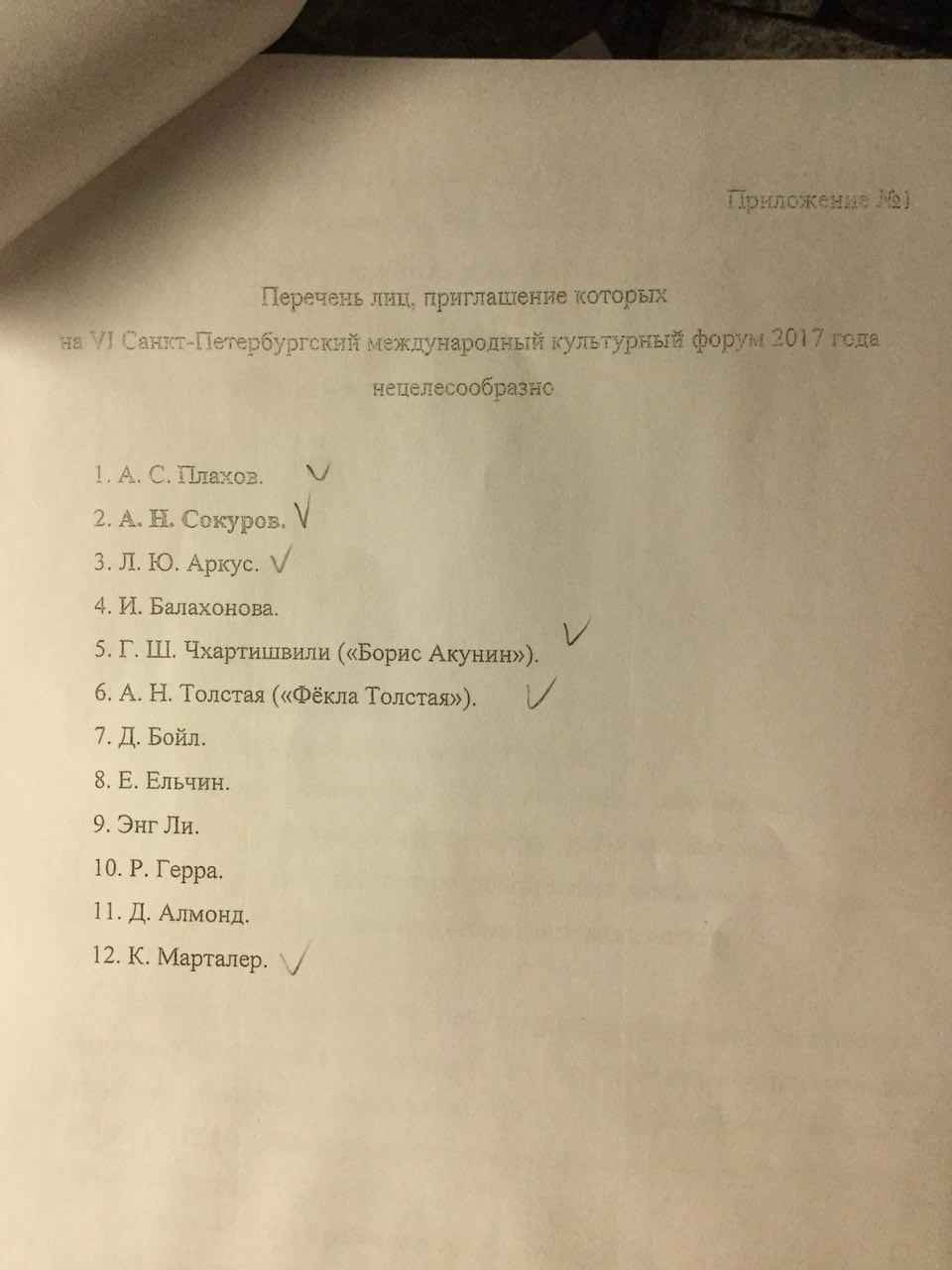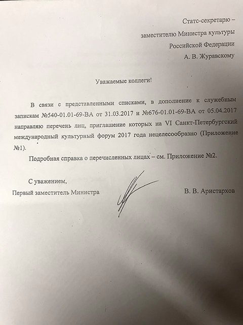 Издание Colta опубликовало список «нежелательных» гостей Петербургского международного культурного форума по секции «Театр». Служебная записка, достоверность которой не подтверждена, подписана заместителем министра культуры Владимиром Аристарховым.