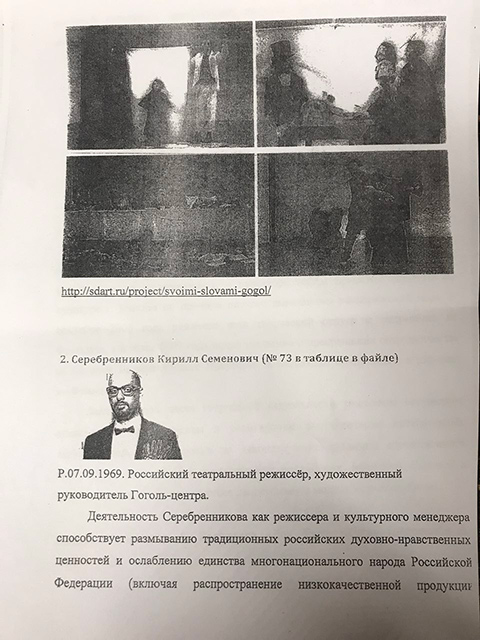 На каждого из театральных деятелей в документе составлено досье. О Серебренникове, например, говорится, что его деятельность «способствует размыванию традиционных российских духовно-нравственных ценностей», а спектакль Крымова «в саркастической и глумливой манере использует образы Пушкина и Гоголя».