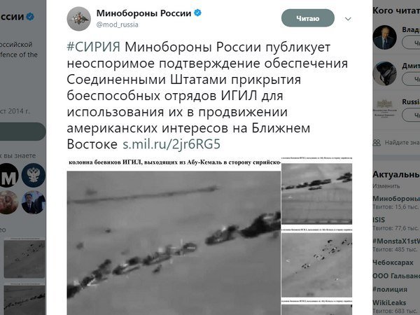 14 ноября ведомство опубликовало фотоматериалы колонны боевиков в Сирии, направляющейся в сторону границы, и заявило, что располагает неопровержимыми доказательствами того, что американские военные оказывают им поддержку. Однако западные СМИ и некоторые пользователи заметили, что фотографии являются скринами из популярной игры, а также старыми военными записями.